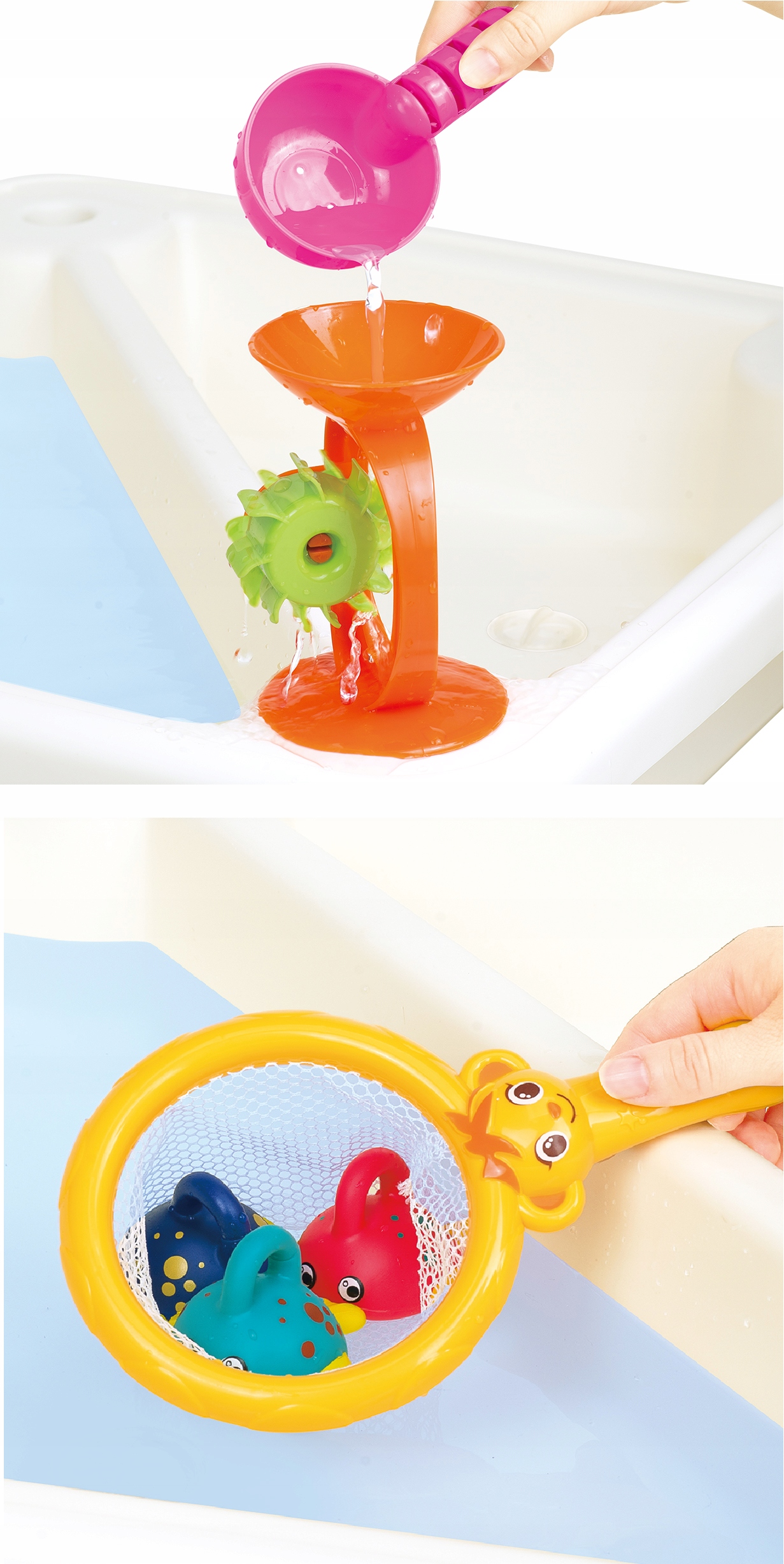 Когда наливаете воду, игрушки начинают вращаться.