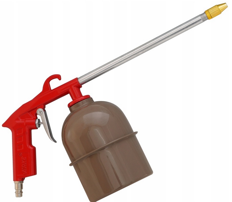 Пистолет для мытья предназначен для очистки с использованием струи сжатого воздуха и чистящего средства. Благодаря бачку и длинной насадке пистолет позволяет проводить уборку даже в труднодоступных местах.