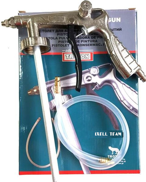 Пистолет предназначен для нанесения антикоррозионных средств, обработки шасси автомобилябитумными средствами, а также ухода за кузовными деталями, профилями, закрытыми воском с использованиемприлагаемый шланг длиной 500 мм с латунным наконечником.