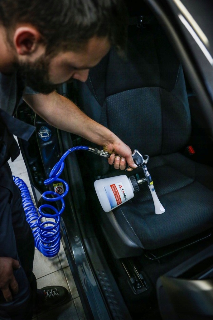 Качественный пистолет для влажной уборки грязи с кузова и салона автомобиля, предназначенный как для любителей, так и для профессионалов, в том числе: воздухозаборники, кондиционеры, зеркальные и пластиковые элементы, сиденья, обивка, ковры, грязь и загрязнения, которые трудно удалить. Благодаря насадке особой формы с вращающимся сердечником пистолет под воздействием сжатого воздуха производит пенистый чистящий раствор, который очищает все элементы, лишь слегка смачивая их! Это очень эффективное устройство, оно использует минимальное количество воды и чистящих средств. Он доходит до всех труднодоступных мест, щелей, куда не может добраться обычная губка, тряпка, кисточка или кисточка!!! Идеально подходит для коммерческой чистки различных типов поверхностей, таких как обивка, мебель, диски, воздуховоды и т. д. Для работы не требуются мощные компрессоры, достаточно давления в 5 бар. Пистолет имеет регулировку дозировки химикатов, что позволяет подобрать раствор под очищаемую поверхность.