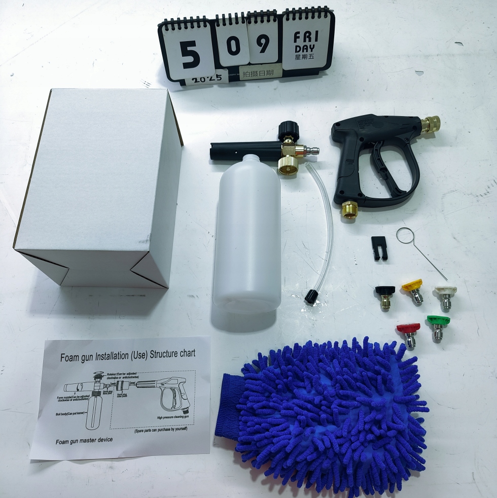 - В комплект пистолета для пены входят все инструменты, необходимые для поддержания чистоты автомобиля и сокращения времени чистки, включая пену пистолет, 5 насадок и чистящая перчатка.