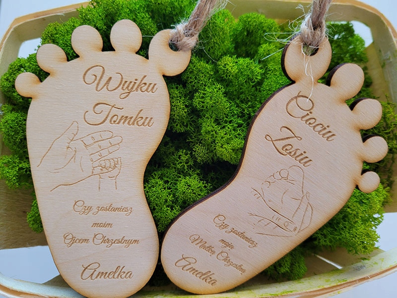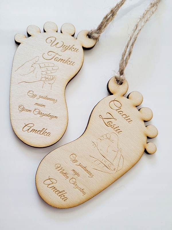 Красивые деревянные подвески на ножки для подарка будущим крестным родителям с вопросом ребенка. Просьба тете и дяде упакована в стильную сумку с древесной ватой и бантиком из джутовой веревки. Оригинальная форма расспроса о крестных станет отличным сувениром на будущее. Деревянный кулон украшен точной индивидуальной гравировкой и джутовым бантиком. Изысканный набор из двух подвесок (на левую и правую ногу) для обоих крестных.