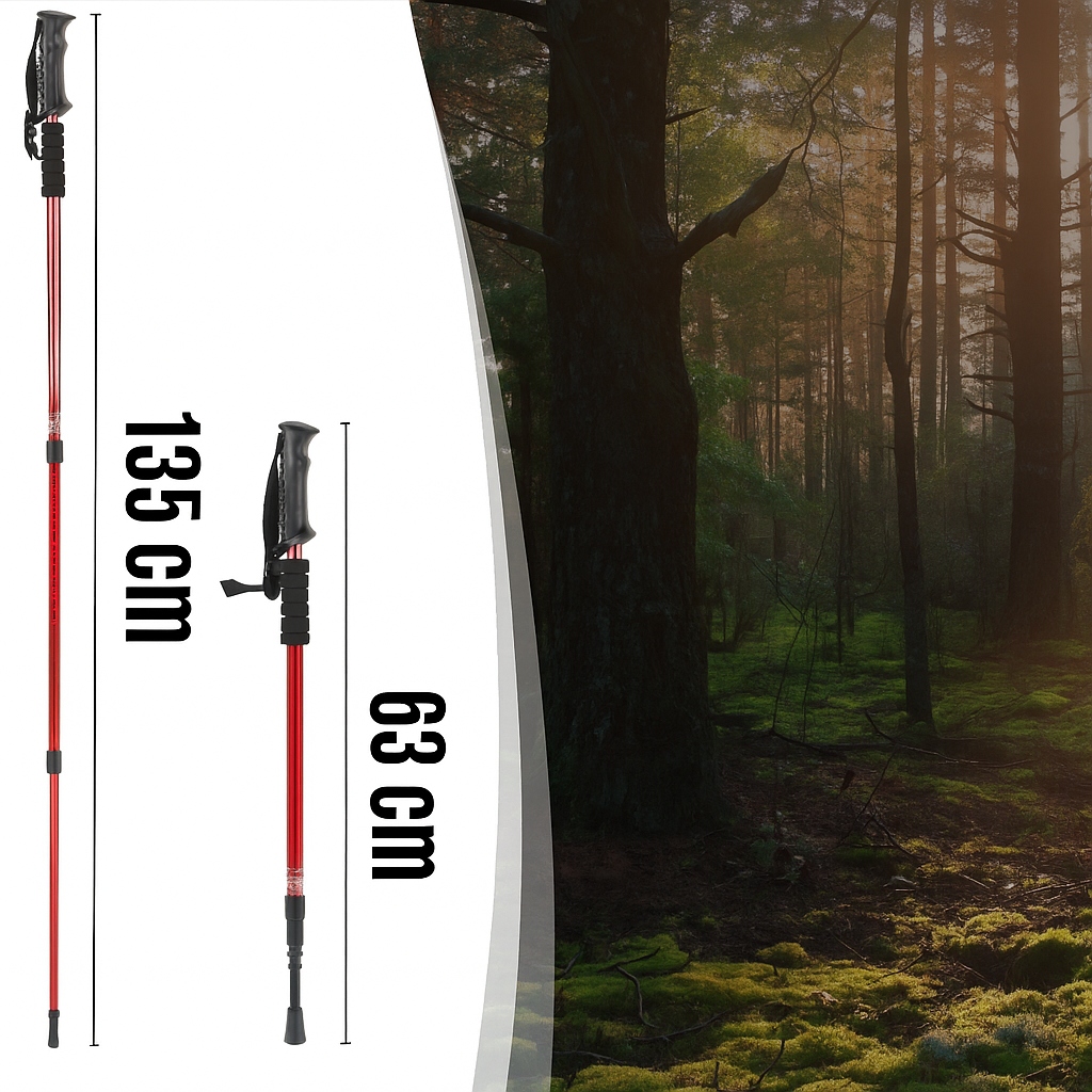 Регулировка телескопической длины (63–135 см) позволяет идеально соответствовать полюсам с высотой пользователя и наклоном области. Стабильные блокады обеспечивают безопасность во время интенсивного марша.