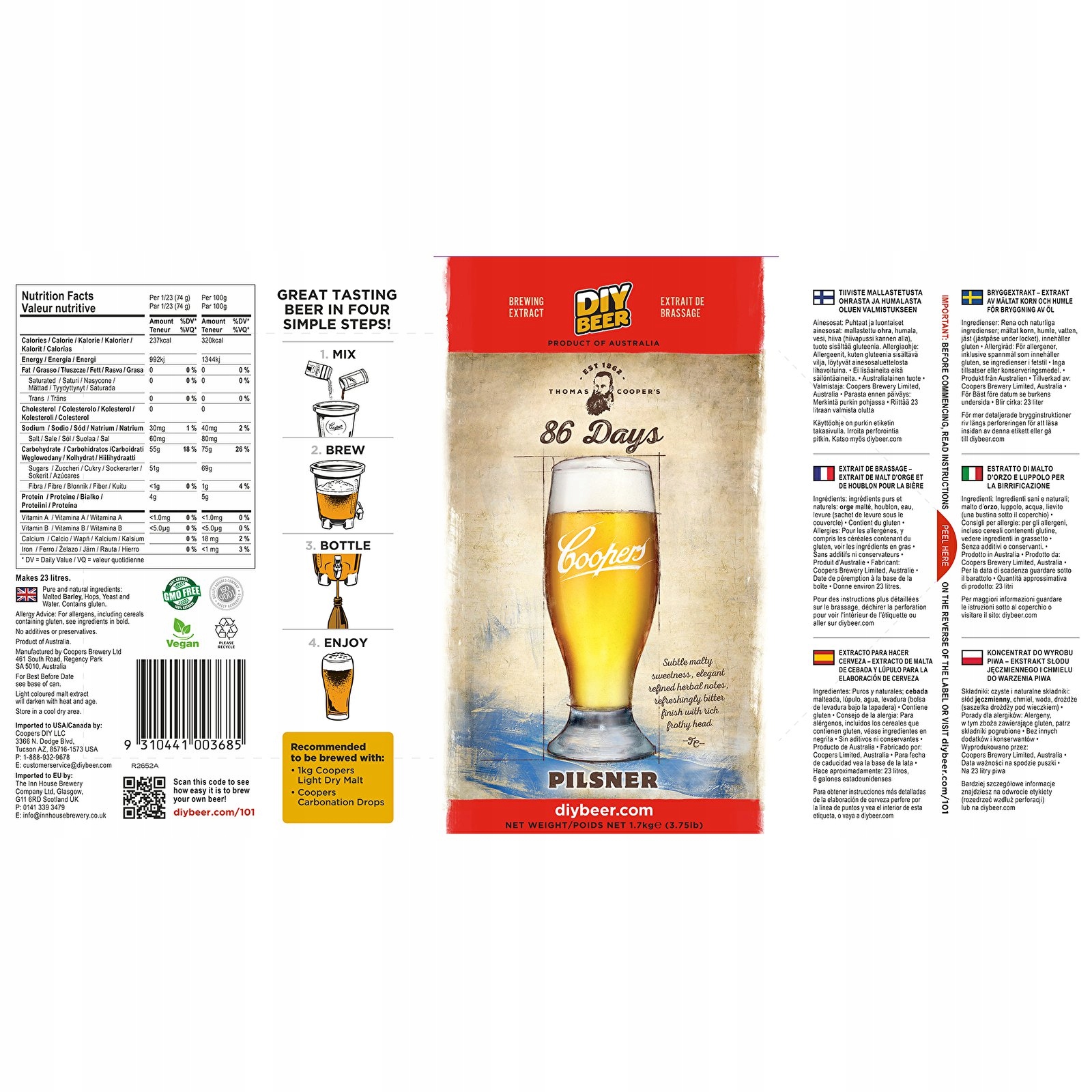 Концентрат 86 дней Pilsner является продуктом бренда Coopers -работы самого высокого класса австралийских специалистов, которые на протяжении поколений были созданы всемирными пивоваренными пивоваренными изделиями -для независимого производства пива Полем Благодаря творческому сочетанию рецептов Coopers с опытом Browin, специализирующейся, среди других При производстве дрожжей и ассортимента для домашних микроборов, сделать ваше собственное пиво теперь проще, чем когда -либо. 86 -дневный концентрат Pilsner производится путем смешивания мелкозрелого ячменя солода с водой с температурой, не превышающей 75 ° C. Следующим этапом производства является фильтрация и испарение оставшейся жидкости в вакуумных условиях, пока она не примет плотную консистенцию меда