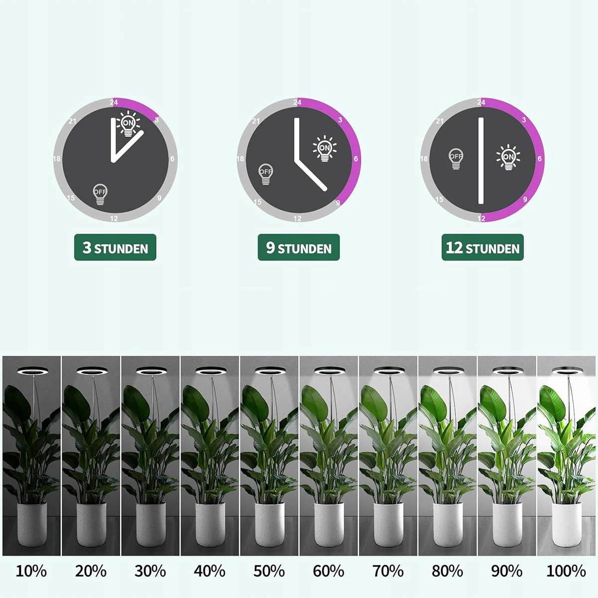 Лампа для растений имеет функцию таймера, которая позволяет установить время включения/выключения на 3 часа, 9 часов или 12 часов в день. Благодаря этому вы обеспечите растениям необходимое количество света и защитите их от чрезмерного солнечного света.