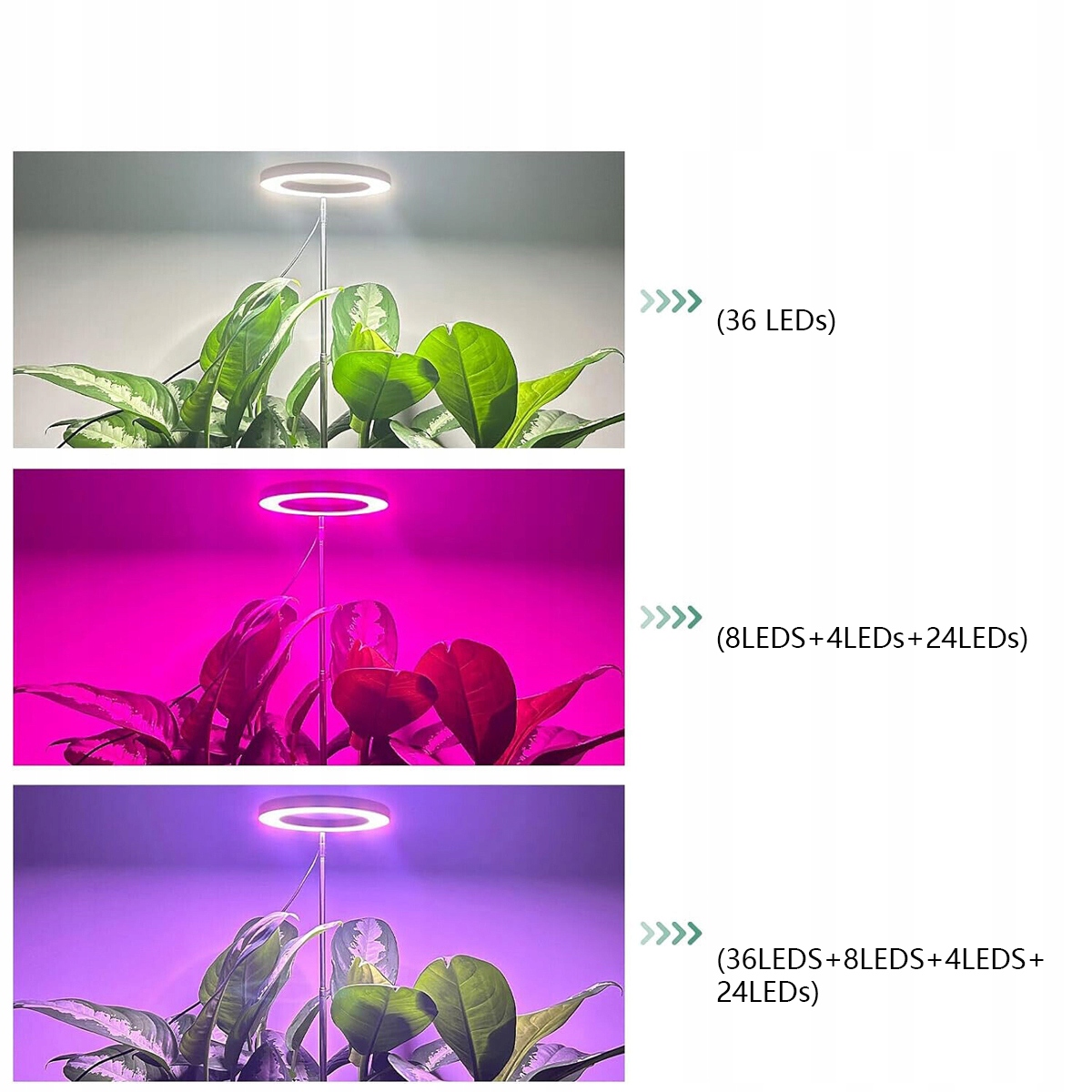 Освещение растений имеет 72 светодиодные лампы (в том числе 36 белых светодиодов, 24 теплых белых светодиода, 8 красных светодиодов и 4 синих светодиода), что эффективно увеличивает площадь освещения растений, поэтому его можно использовать повторно на одних и тех же растениях одновременно, и он является идеальным источником света для горшечных растений.