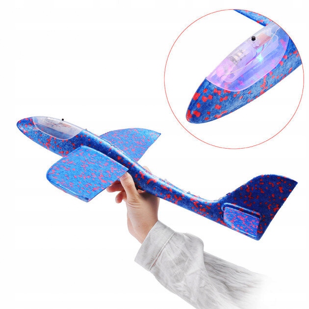 Самолет из пенополистирола доставляет большое удовольствие как маленьким, так и большим детям. Самолет полностью изготовлен из пенополистирола, А легкий дизайн и обтекаемая форма позволяют легко парить в воздухе. В самолете имеютсямигающие светодиодные фонари, которые разнообразят детские развлечения в сумерках. После включения светодиодные фонари работают в 3-х режимах(светят постоянно и мигают с двумя разными скоростями). >