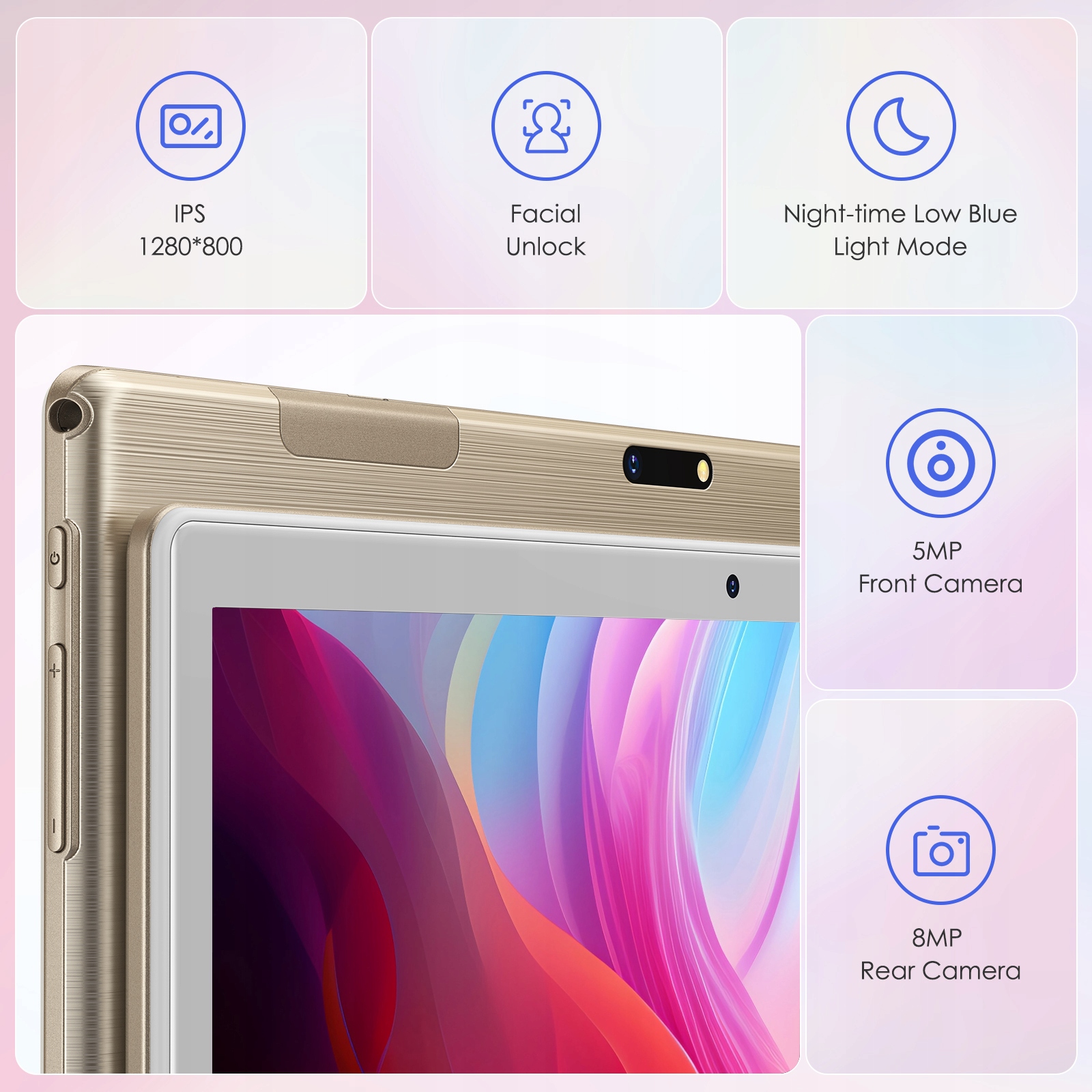 【Экран Puls HD и двойная камера】 Благодаря 10-дюймовому экрану IPS G+G с разрешением 1280*800 пользователи могут смотреть HD-видео с фронтальной камерой 5 МП и задней камерой 8 МП, чтобы проводить онлайн-уроки и видео. чат.