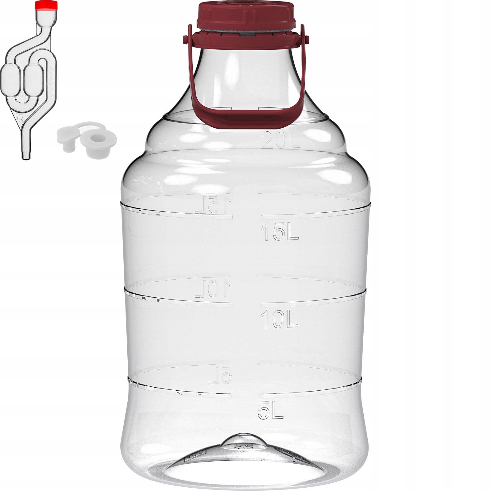 Небьющийся пластиковый баллон для вина и пива с завинчивающейся крышкой, трубкой для брожения и ручкой для переноски, 20 л - широкое отверстие, завинчивающаяся крышка, трубка для брожения, мерная шкала.