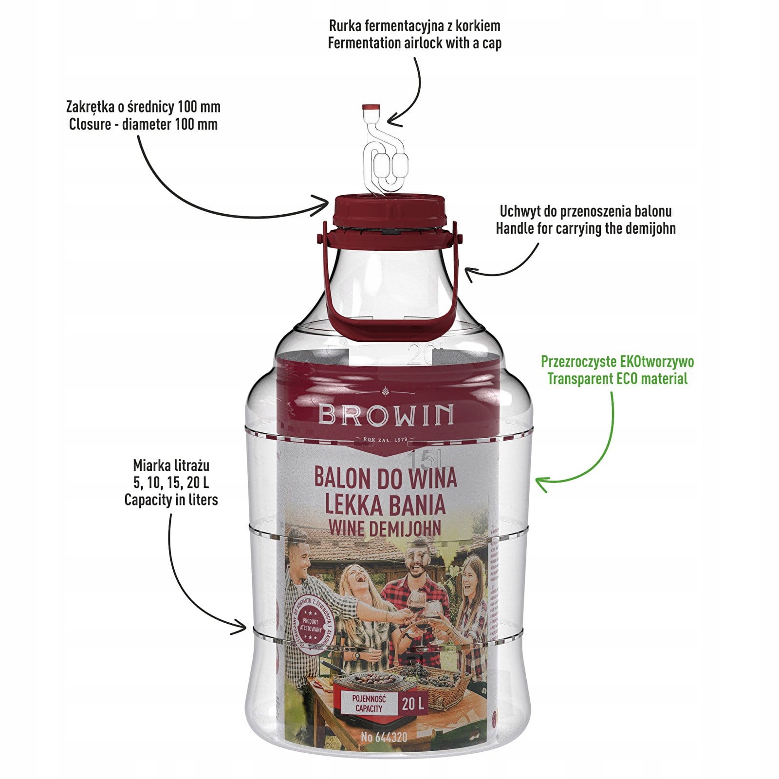 Использовать баллон Lekka Bania станет проще благодаря этому. по шкале, отмеченной на стене, что позволит вам проверить заданное количество. Просто поместите настройки в баллон и закройте его крышкой с бродильной трубкой. Язычки на крышке облегчают открытие и закрытие баллона, а ручка позволяет носить его, когда он пуст. Особая конструкция крышки не имеет уплотнителя, поэтому можно не опасаться, что под ней скапливается плесень и бактерии.