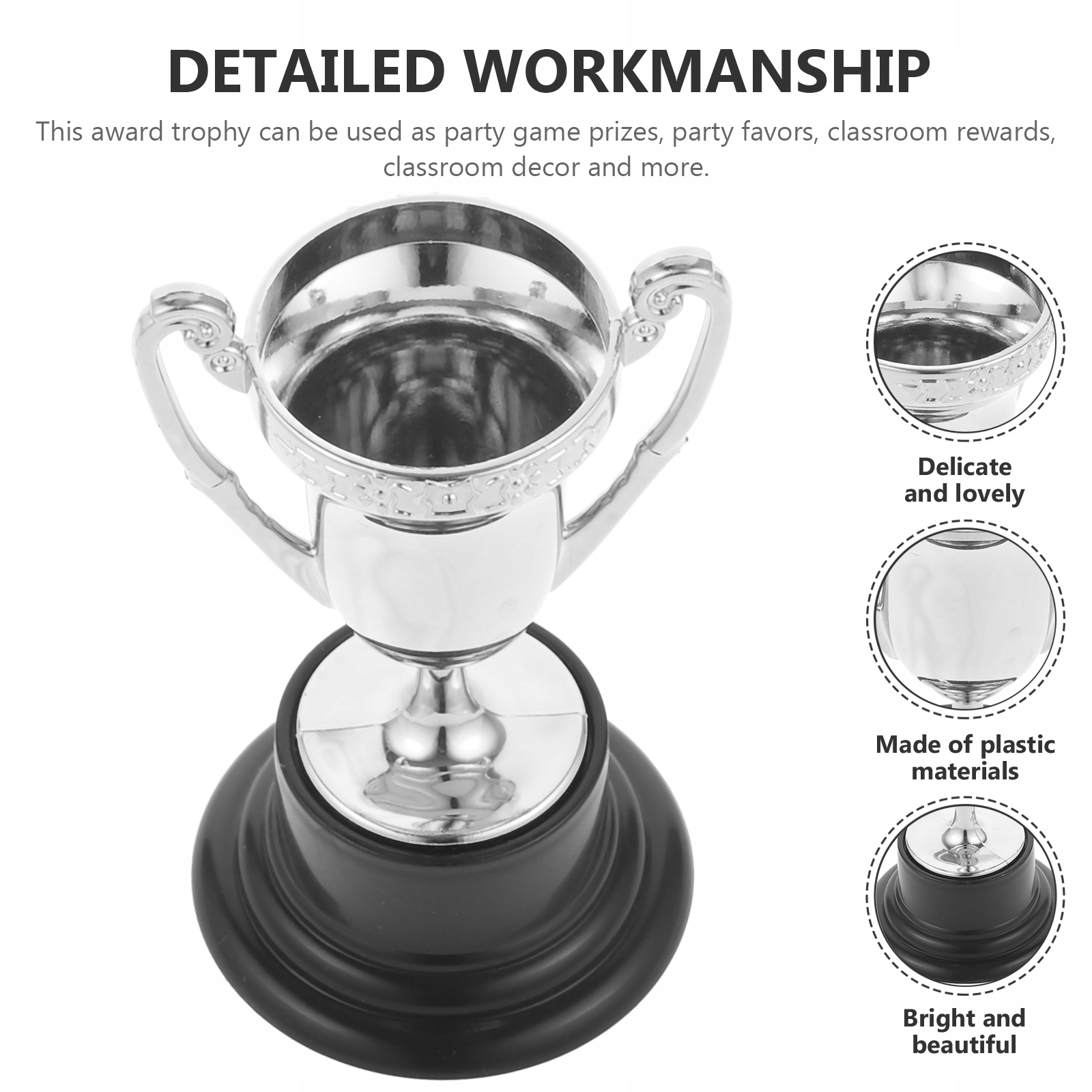 В этом трофее используется пластик. Этот трофей – это большая услуга и поощрение для всех ваших детей. Детальное качество изготовления и портативность для переноски. Этот призовой трофей можно использовать в качестве призов для партийных игр, сувениров для вечеринок, классных призов, украшений для классов и многого другого.