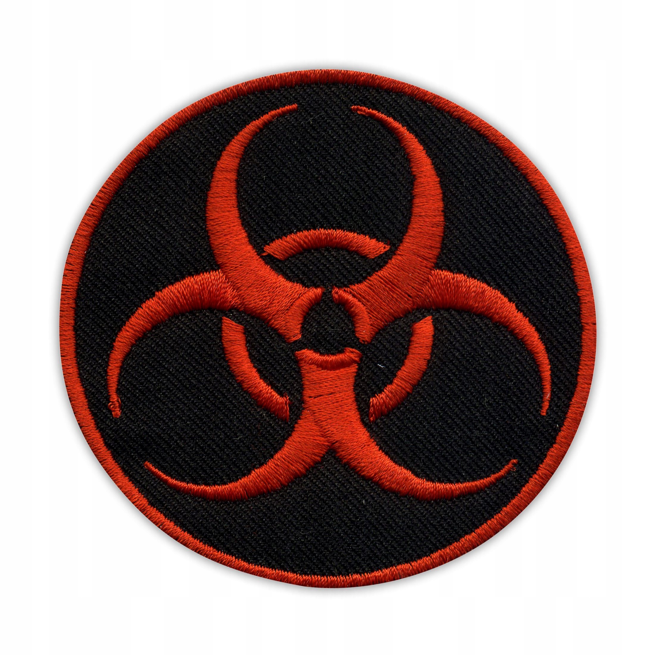 Нашивка с предупреждением о биологической опасности, круглая, на черном фоне, выполнена в технике компьютерной вышивки.