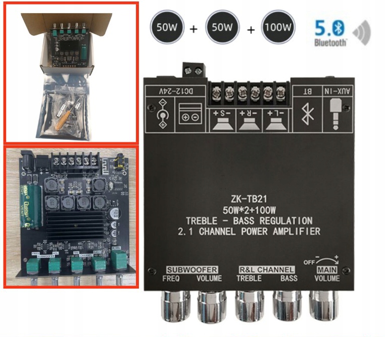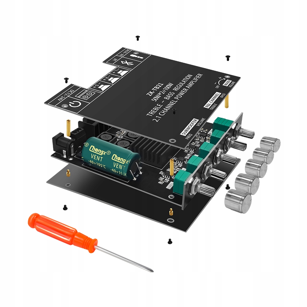 Аудиоусилитель 2.1 со встроенным беспроводным соединением Bluetooth в практичном и эстетичном корпусе. Он позволяет подключить2 динамика мощностью 50 Вт и сабвуфер мощностью 100 Вт. Усилитель обеспечивает очень хорошее качество звука, усиление основано на двух независимых микросхемах TPA3116D2, один для стереоканала, другой для сабвуфера. На плате установлен большой конденсатор для выделения большого количества мощности, а предусилитель имеет очень низкий уровень шума.
