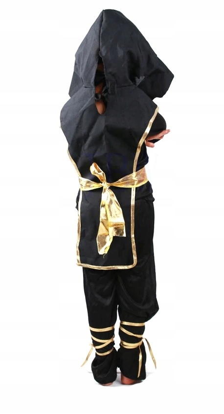 Костюм-тройка Костюм ниндзя черного цвета с золотыми элементами. Хорошо сделанный, немного гибкий и подогнанный. Благодаря нашему предложению каждый поклонник воинов-ниндзя «к счастью» перевоплотится в отважного воина с Дальнего Востока. Интересный костюм перенесет вас в мир комиксов и сказок, которые напомнят ваше детство.