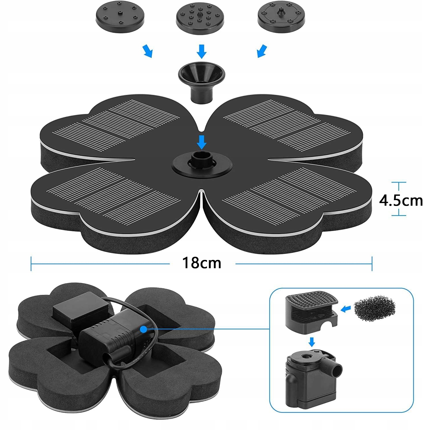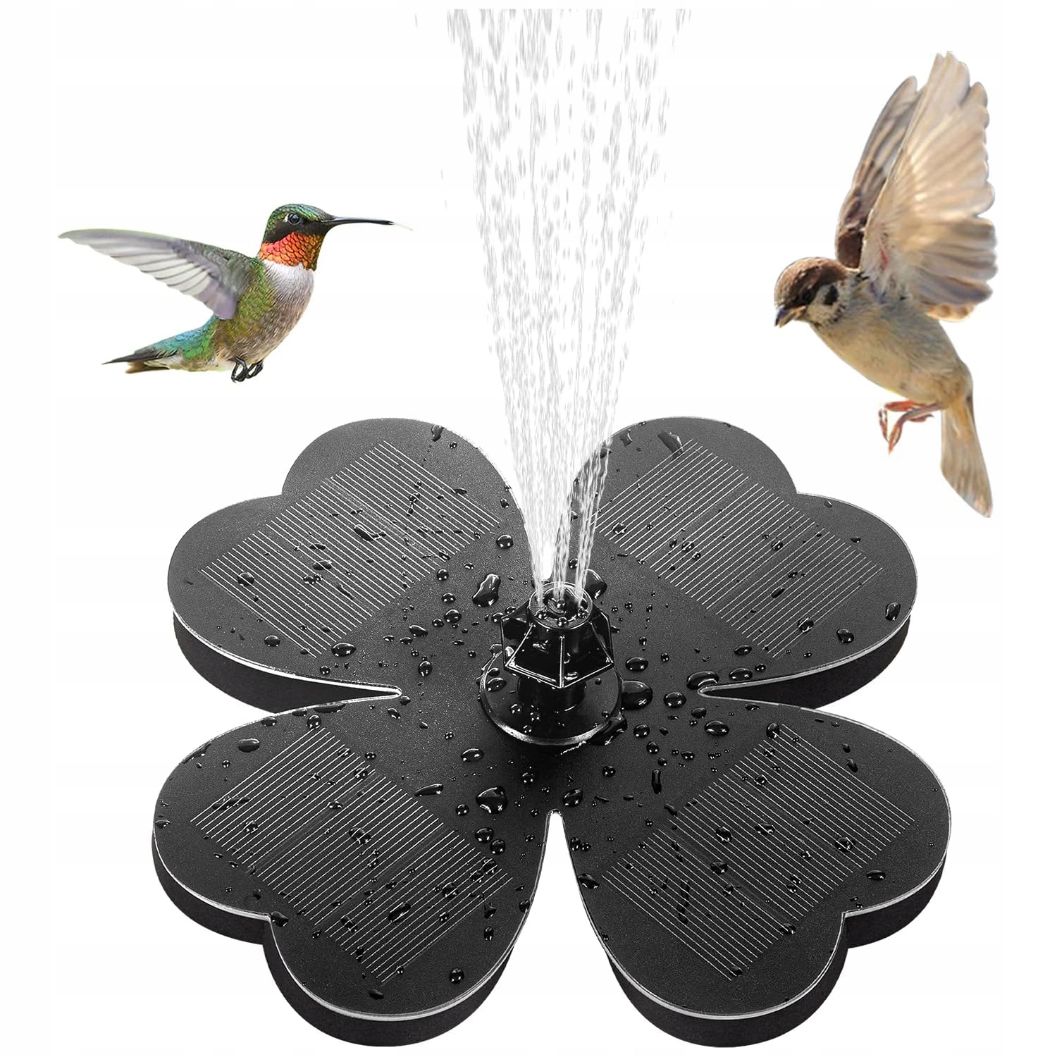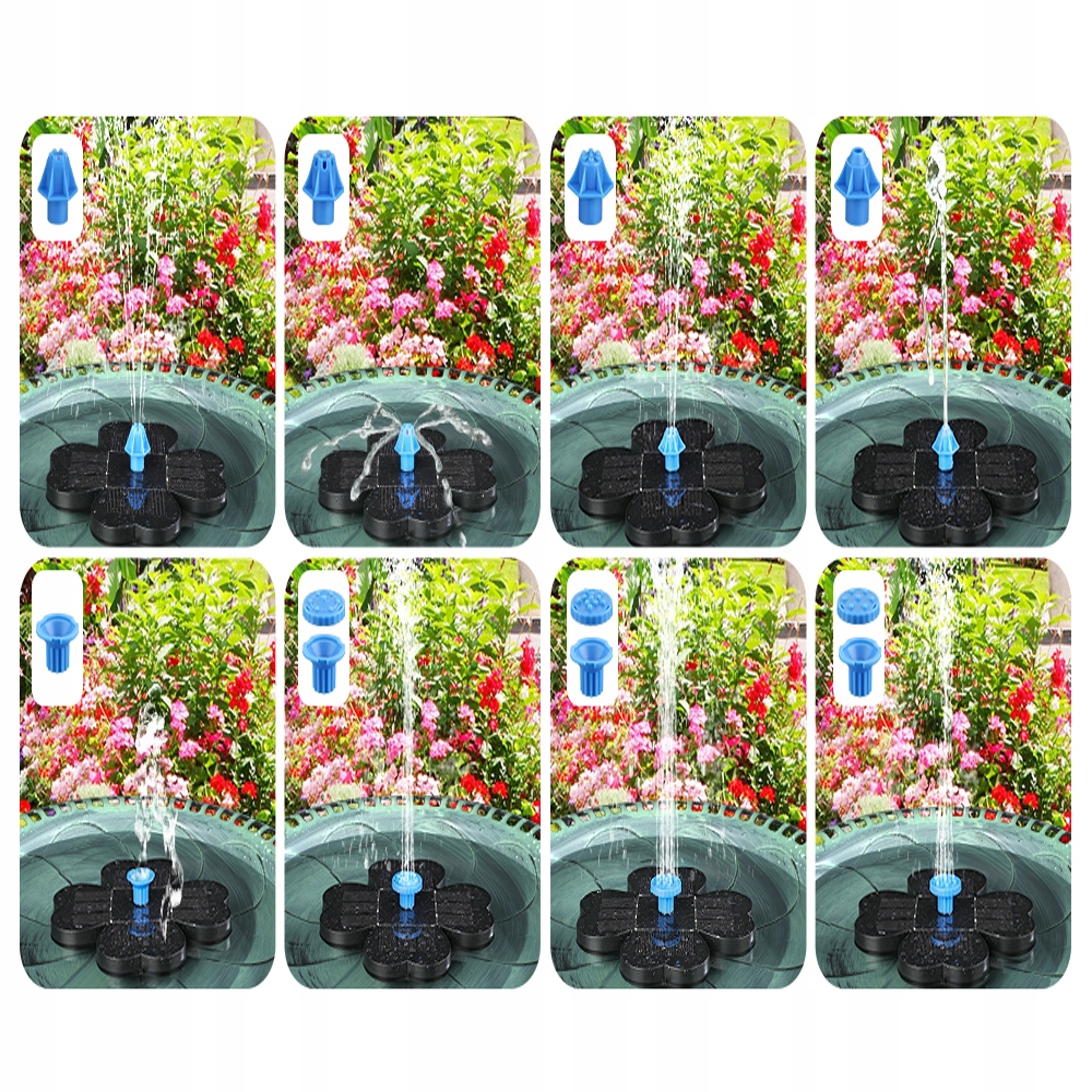 Уникальная форма четырехлистного клевера солнечного фонтана изысканна и красива, что более привлекательно, чем традиционные круглые насосы. Солнечный насос для фонтана имеет 8 форсунок, вы можете свободно заменить их и заменить их в соответствии с вашими предпочтениями, создавая различные красивые сцены спрея, чтобы украсить внутренний дворик.