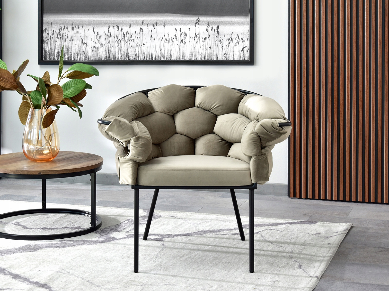 Если при обустройстве интерьера вы ищете оригинальный дизайн, вам нельзя игнорировать кресло PILO. Это удивительное кресло станет идеальным элементом интерьера, привлекая внимание своим необычным внешним видом и подчеркивая характер помещения. Материал обивки кресла PILO – высококачественный бархат, который выглядит феноменально по своей структуре и мягкости. Песочный цвет прекрасно гармонирует с фактурой материала, а черная рамка тонко подчеркивает целое. Каркас изготовлен из высококачественной стали с порошковым покрытием, устойчив и долговечен.