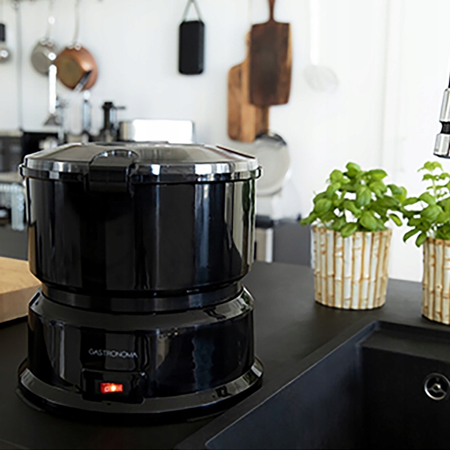 Gastronoma peeler: вес 1,6 кг, мощность 85 Вт, пилинг 1 кг в 2-4 мин, черный, электронный сигнал 220-240В, 1-й кабель с хранением. Силиконовые ноги, защитный переключатель, дополнительный салатный вихрь.