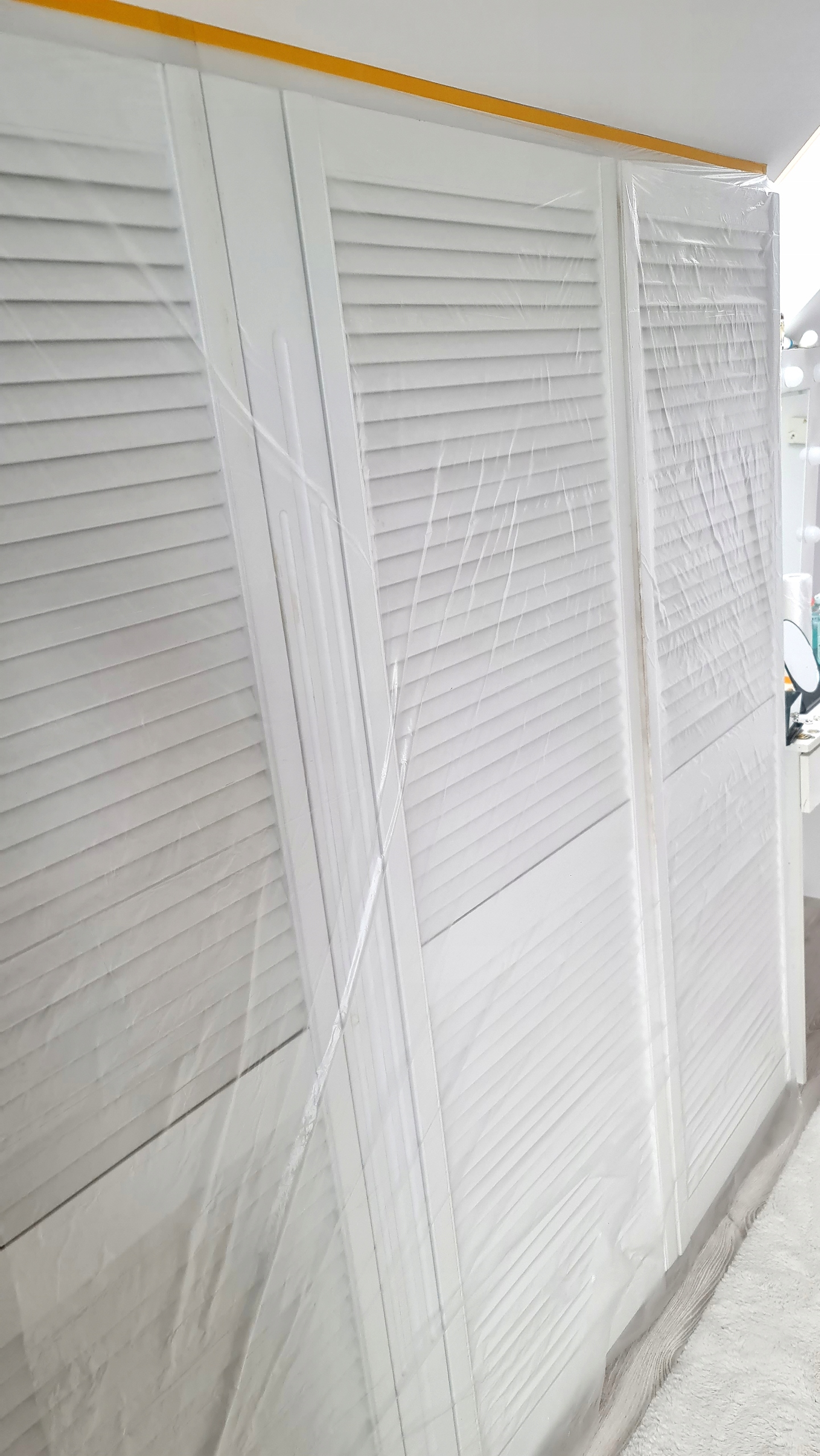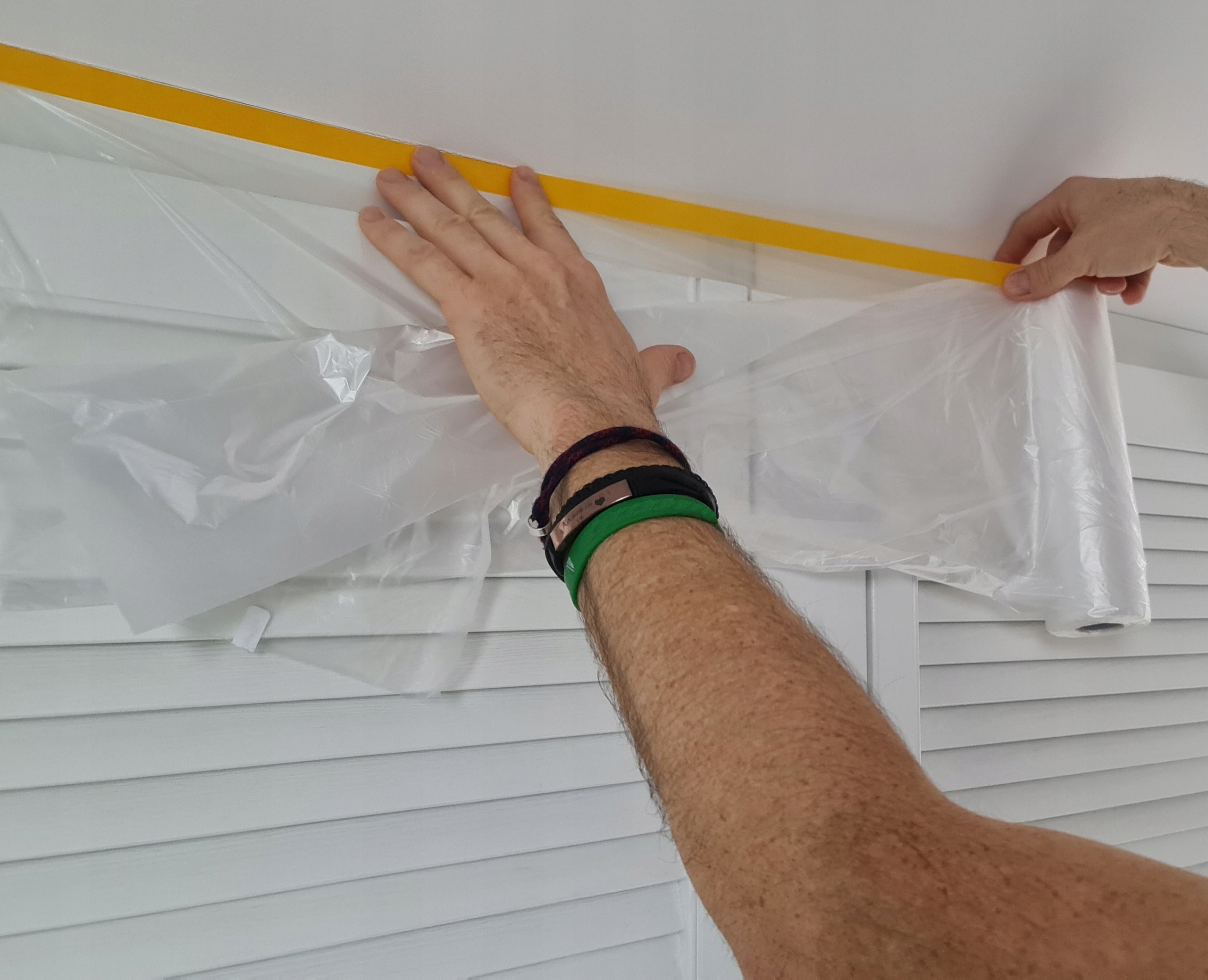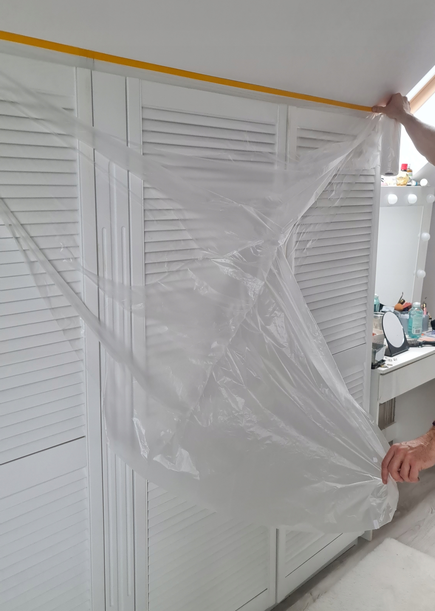 После распаковки фольга сворачивается в рулон, содержащий 33 шт. м или 17 м фольги (пример, как выглядит рулон фольги, можно увидеть на фотографиях на сайте). При размотке рулона клейкая лента на рулонах отрывается. Прикрепляем эту сторону скотчем к верхнему краю поверхности, которую хотим защитить. Приклеив необходимую длину, отрежьте фольгу и разверните ее, например вниз, если хотите закрепить ее на стене (или шкафу, как показано на фотографиях). Это облегчает вашу работу. При необходимости его можно легко отрезать специальным ножом. После полного развертывания рулона фольга самостоятельно приклеится к защищаемой поверхности и поэтому не требует дополнительной проклейки скотчем.