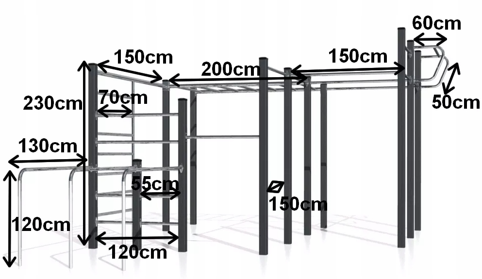 - Высота брусьев и горизонтальной лестницы: 230 см