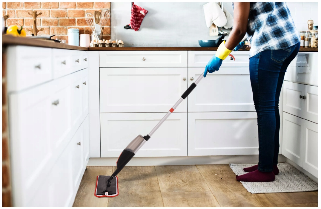 Швабра с распылителем и чехлом из микрофибры. Благодаря вместительному резервуару, расположенному над шваброй, она позволяет дозировать жидкость во время работы — достаточно нажать кнопку, расположенную в ручке.