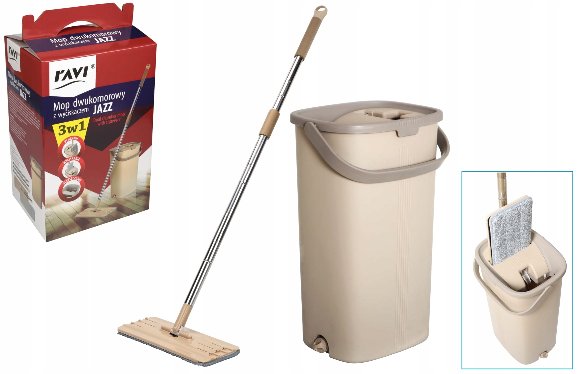 Современная компактная плоская швабра с двухкамерным ведром и прочной ручкой.
