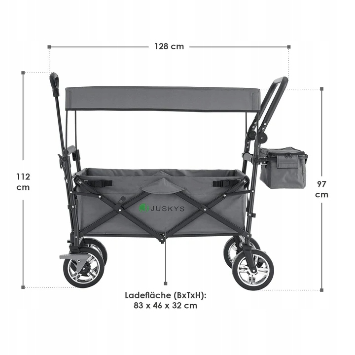Откройте для себя складную ручную тележку с крышей и сумкой для ваших приключений! Это идеальный компаньон пешеходных поездок, приключений на свежем воздухе и даже полезных при совершении покупок. Благодаря сплошной раме, он готов быть загружен до 120 кг. Таким образом, следующая поездка будет иметь легкость и удобство. Что еще такое транспортная тележка? Благодаря механизму складывания вы можете легко скрыть его в багажнике.
