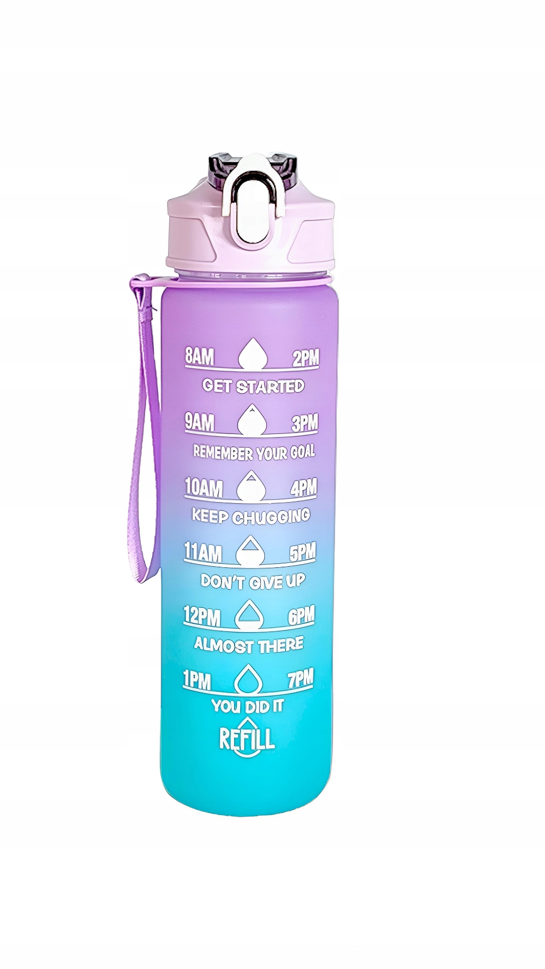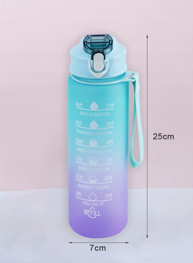 На бутылке имеется мерная мера, показывающая, сколько воды было выпито. Кроме того, на каждой мерной чашке имеется отдельный текст, побуждающий вас продолжать пить воду. Примите вызов для улучшения здоровья!