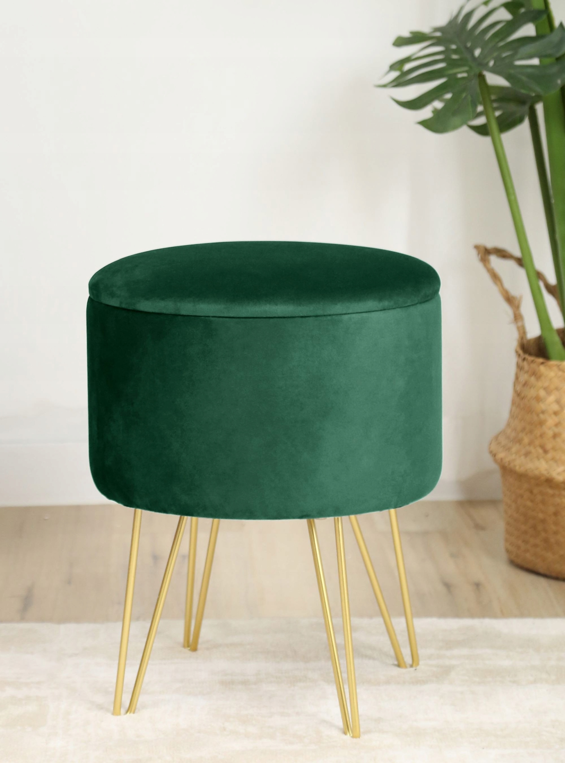 Подставка для ног или пуф – отличное дополнение гостиной или спальни. Благодаря ему уставшие после долгого дня прогулки ноги смогут отдохнуть, а когда пуф выполнен из мягкого бархата, это только усиливает приятные впечатления от отдыха. Современный вид создается за счет аксессуаров: в нашем пуфе используются металлические ножки, окрашенные в золотой цвет, который так моден в этом году. Открывающаяся крышка открывает доступ к контейнеру, в который можно положить ненужные в повседневном использовании предметы.
