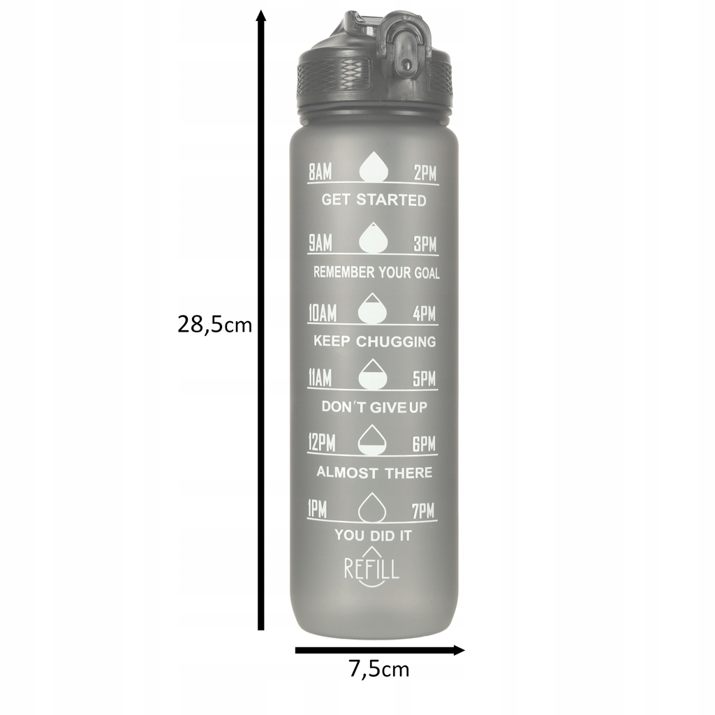 Бутылка с водой с вместимостью 1 литр - идеальный способ остаться Увлажнен весь день! Благодаря этому вы избежите необходимости покупать Одноразовые бутылки воды. Бутылка с водой оснащена практической мундштукой солома, которая делает питье из него чрезвычайно удобным и не требует наклонение. Кроме того, защитный клип защищает крышку бутылки от Случайное открытие. Мера с часами и мотивационными лозунгами поощряет Для обычной питьевой воды. Он был сделан из долговечного и безопасного для Контакт с едой Тритана, не внося BPA