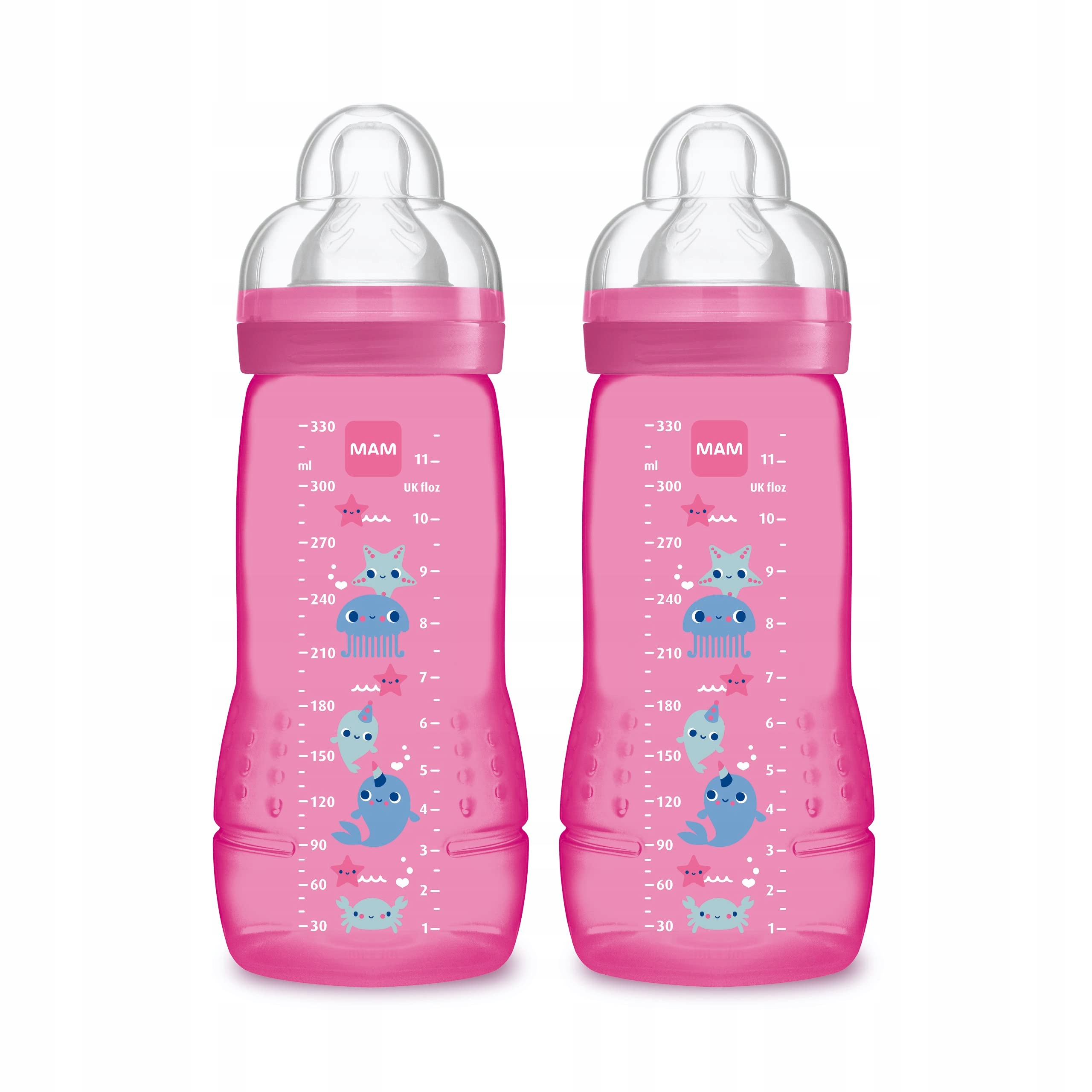<р> ОПИСАНИЕ ПРОДУКТА <р> Бутылочка MAM Easy Active для 2-го возраста — бутылочка, которую легко держать, подходит для активных малышей <р> Ваш шестимесячный ребенок или старше каждый день узнает что-то новое, поэтому важно предложить ему все необходимое для развития! Бутылочка MAM Easy Active для 2-го возраста со сверхбыстрым потоком была разработана в сотрудничестве с медицинскими экспертами: благодаря ей у вашего ребенка может быть бутылочка, которая соответствует его потребностям. Бутылочка совместима со всеми размерами сосков MAM, малым и средним потоком, поэтому вы можете адаптировать бутылочку к потребностям вашего ребенка. Пустышки MAM SkinSoft легко принимаются 94% детей*: они облегчают переход от грудного вскармливания к кормлению из бутылочки. Контейнер, разработанный без BPA и BPS, можно использовать с грудным молоком или детской смесью - в этом случае крышку от утечек можно использовать в качестве дозатора для отмеривания соответствующих количеств молочной смеси. Ручка этой эргономичной бутылочки удобна в использовании как малышу, так и родителям. <р> Преимущества бутылочки Easy Active. <р> *Эргономичность, позволяющая легко держать ребенка. <р> * Сверхбыстрый поток, идеально подходит для детей, которые научились пить быстрее <р> * Соску принимают 94% младенцев <р> * Ниппель X-flow, сверхвысокая скорость <р> * Простота ухода благодаря широкому открыванию <р> * Формат: 2 х 330 мл, розовый <р> *Исследование рынка 2010–2020 гг., испытания проведены на 1572 младенцах <р> ИНГРЕДИЕНТЫ <р> Бутылка изготовлена из полипропилена, гигиеничного материала, легко чистящегося и относительно гибкого. Не содержит бисфенола-АПараметры продукта