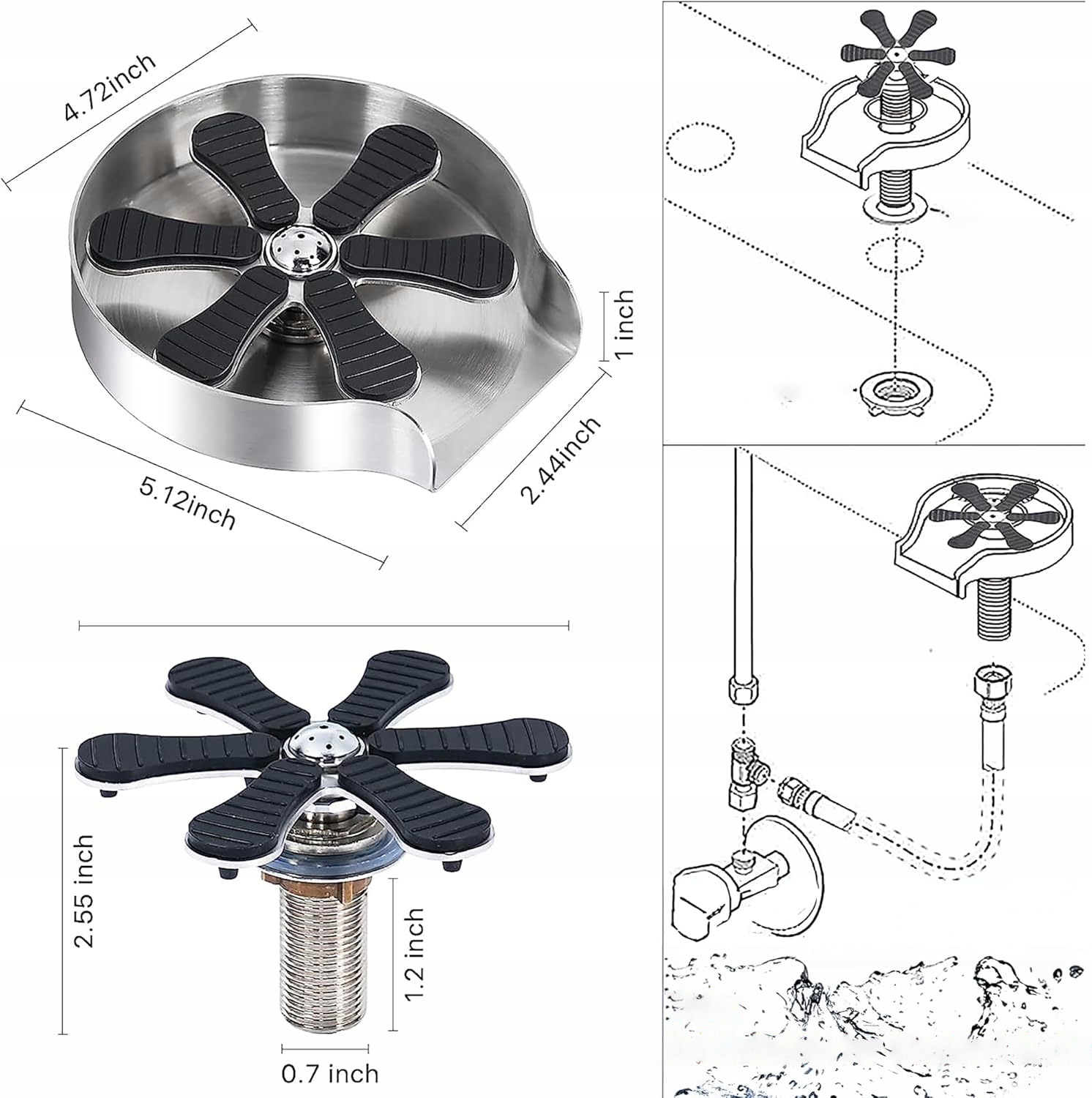 - Мойка для бутылок подходит для многих мест, подушечки для чашек диаметром 5,12 дюйма (около 13 см) достаточно для ополаскивания большинства сосудов для питья, а диаметр отверстия составляет 4,33 дюйма (около 11 см).