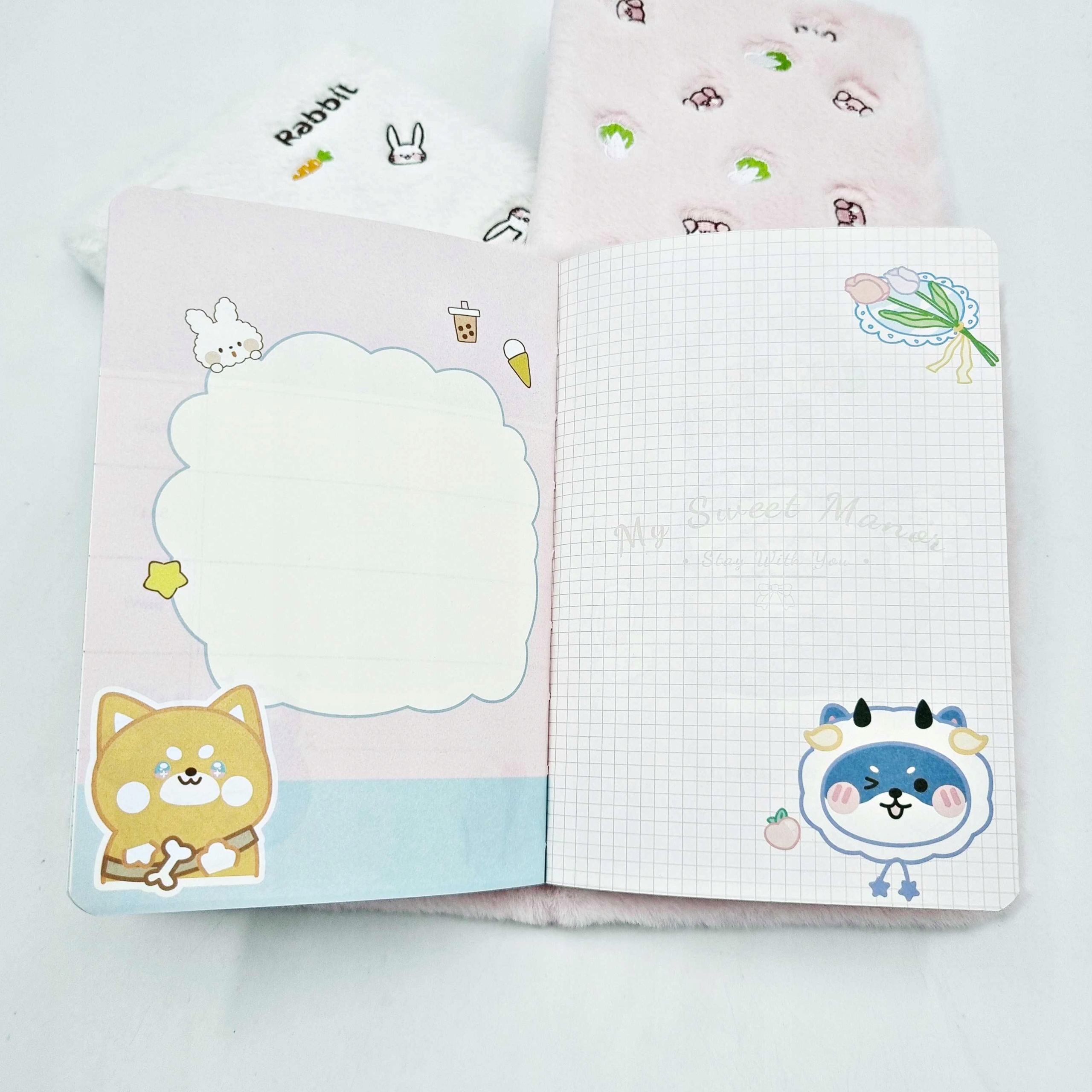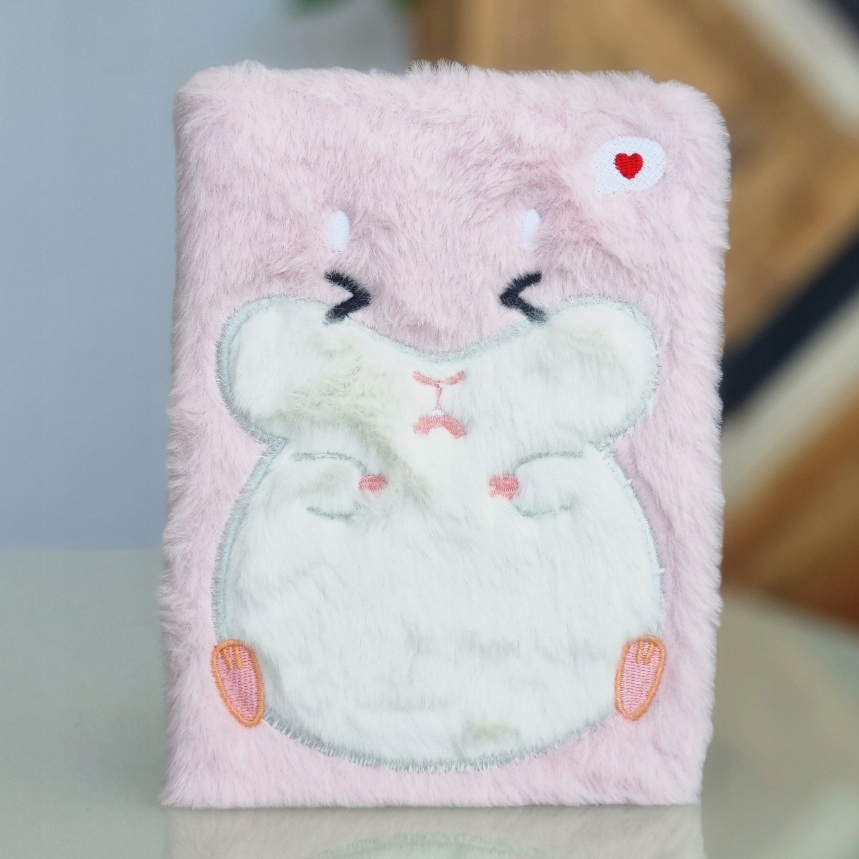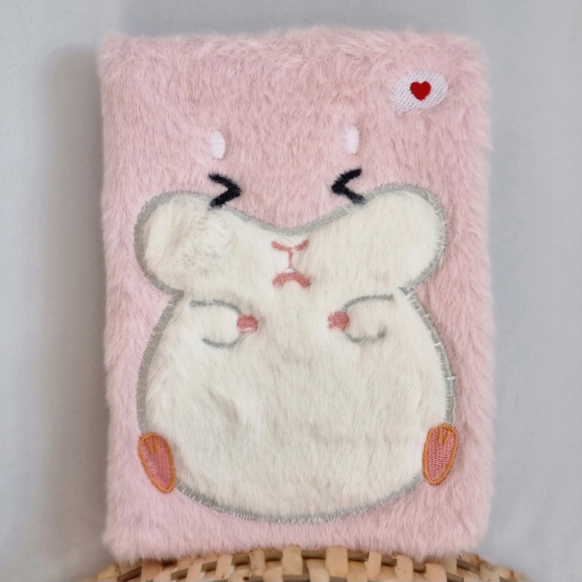 У блокнота плюшевая обложка с изображением РОЗОВОГО ХАМСТИКА.