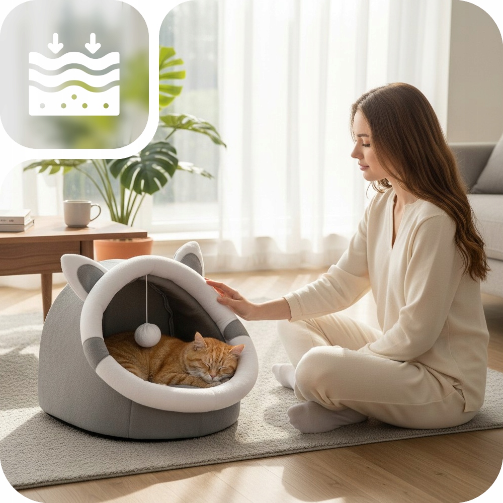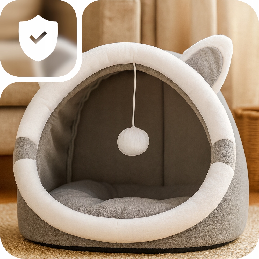 Мягкая и необычайно очаровательная лежанка создана для кошек и маленьких собак, которые любят тепло, мягкость и ощущение уюта. Благодаря приятным на ощупь материалам, декоративным ушкам и помпону ваш питомец будет чувствовать себя не только комфортно, но и безопасно 😻✨