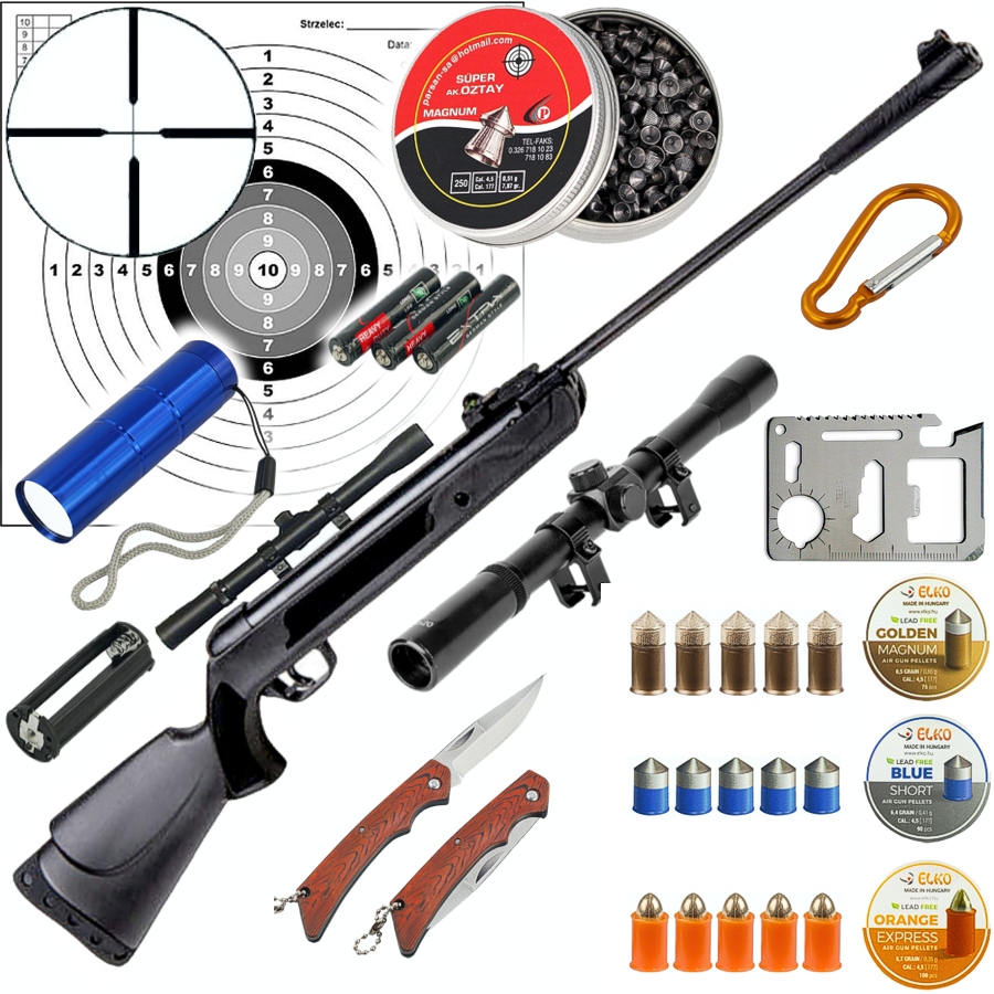Основной боеприпас, входящий в комплект – пули калибра 4,5 мм. 250 шт. Плюс комплект стрелковых мишеней.