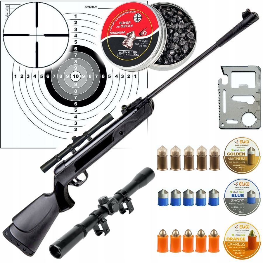 Основной боеприпас, входящий в комплект – пули калибра 4,5 мм. 250 шт. Плюс комплект стрелковых мишеней.