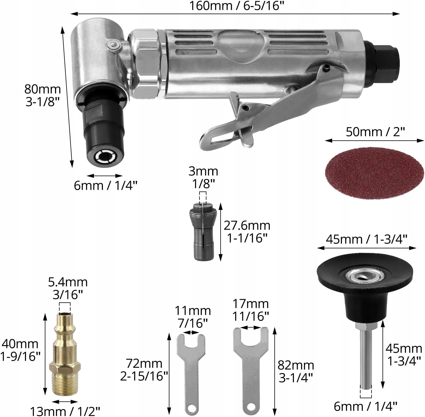 ПНЕВМАТИЧЕСКАЯ УГЛОВАЯ ШЛИФОВАЛЬНАЯ МАШИНА С ХВОСТОВИКОМ 1/4 ДЮЙМА, 50 мм, 2000 об/мин