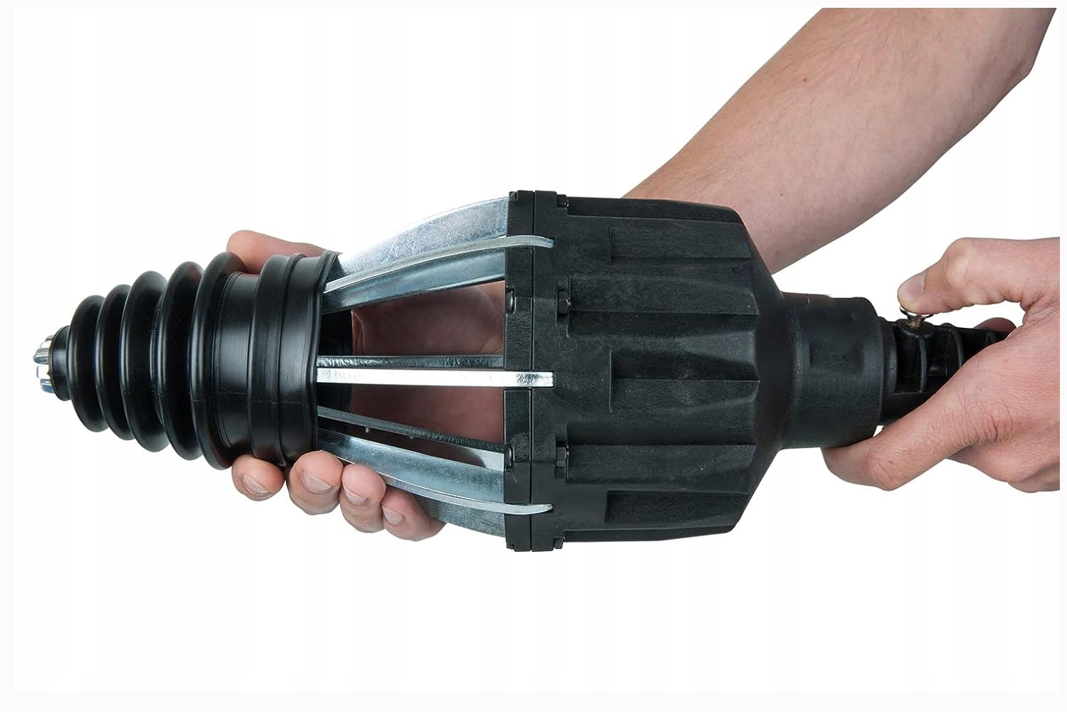 Устройство с пневматическим приводом, предназначенное для установки резиновых чехлов элементов подвески и привода автомобилей. Предотвращает повреждение полуоси.