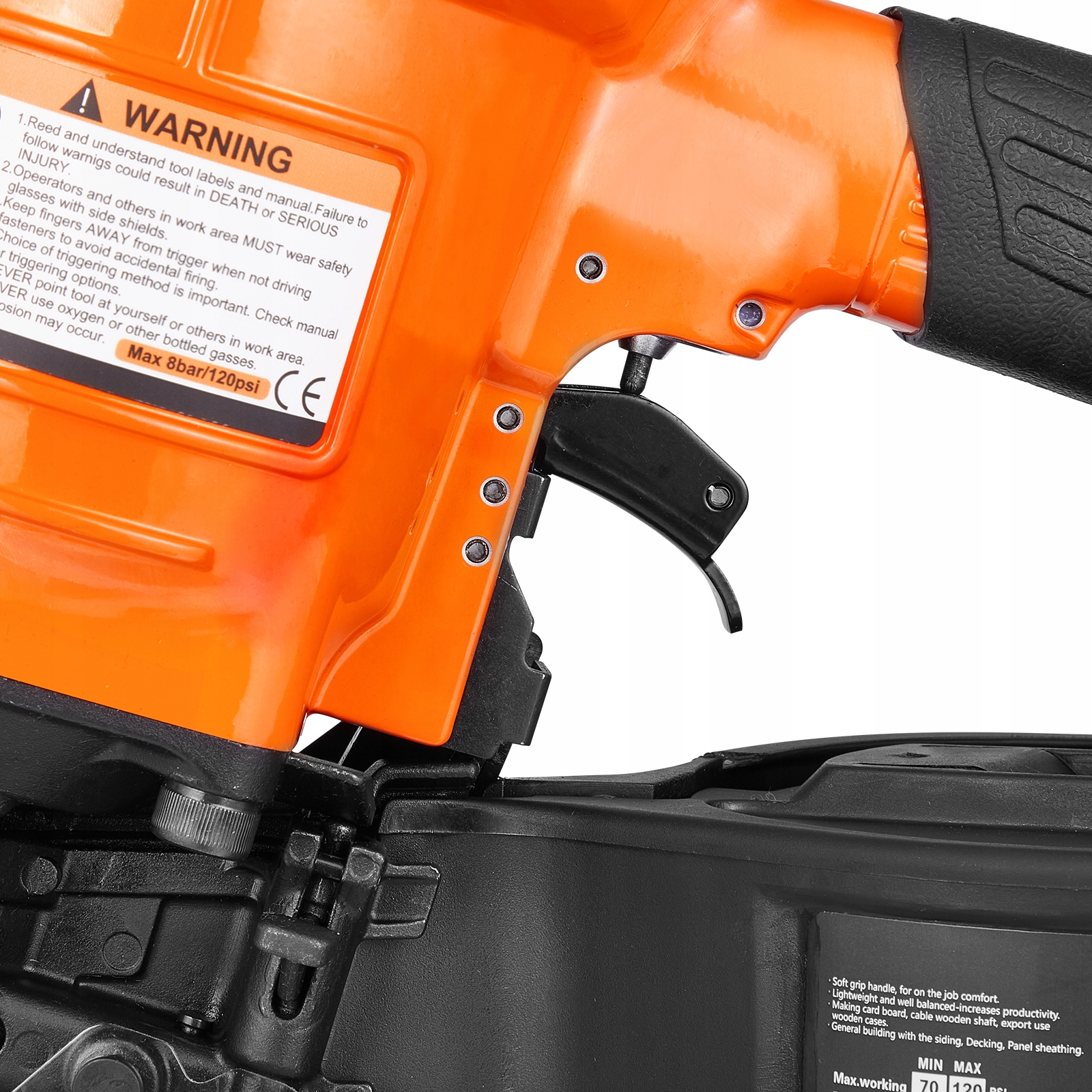 Этот спиральный гвоздь совместим с воздушными компрессорами с вместимостью более 15 галлонов и работает в диапазоне давления 70-120 фунтов на квадратный дюйм. Так что это идеальный инструмент как для профессиональной работы, так и для проектов DIY.