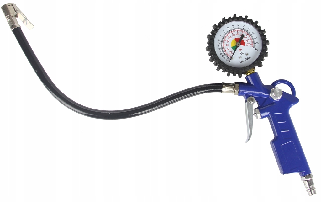 Оснащенный манометром, пистолет для накачивания идеален для работ, связанных с накачиванием и контролем давления в пневматических шинах.