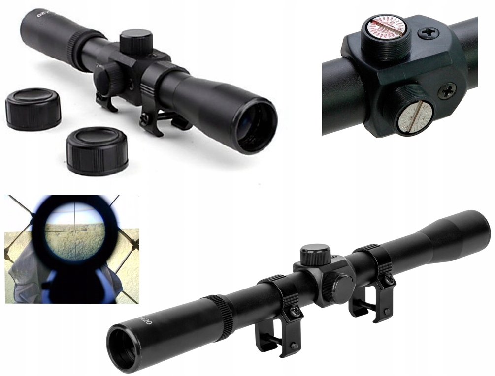 Технические данные Увеличение: 4х / Диаметр линзы: 20 мм / Крестовина: 30/30 / Поле зрения (м/100м) : 7, 5 / Длина 270 мм / Вес: 101 г