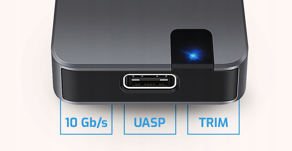 Благодаря интерфейсу USB-C 3.2 Gen 2 x 1 вам не придется беспокоиться о скорости передачи данных. Она может достигать 10 Гбит/с. Высокую производительность также гарантируют команда TRIM и протокол UASP, благодаря которым USB-устройство может выполнять несколько команд одновременно, не отказываясь ни от одной из них.