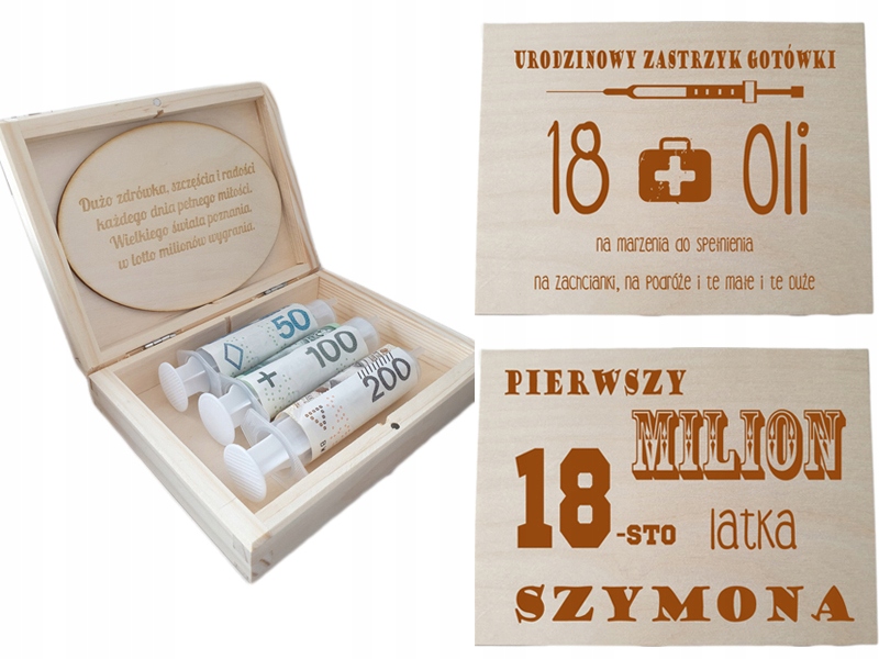 <р> Пожалуйста, укажите выбранный вами узор в комментарии. <р> Пожалуйста, предоставьте подробную информацию о выбранном шаблоне в комментарии. <р> (в зависимости от шаблона: имя, ник, дата, возраст, пожелания, от кого) <р> В предложение входит только коробочка с гравировкой с пожеланиями и шприцами. <р> В предложение не входят банкноты, изображенные на некоторых фотографиях. <р> Они используются только для презентации продукта.Внешние размеры продукта: