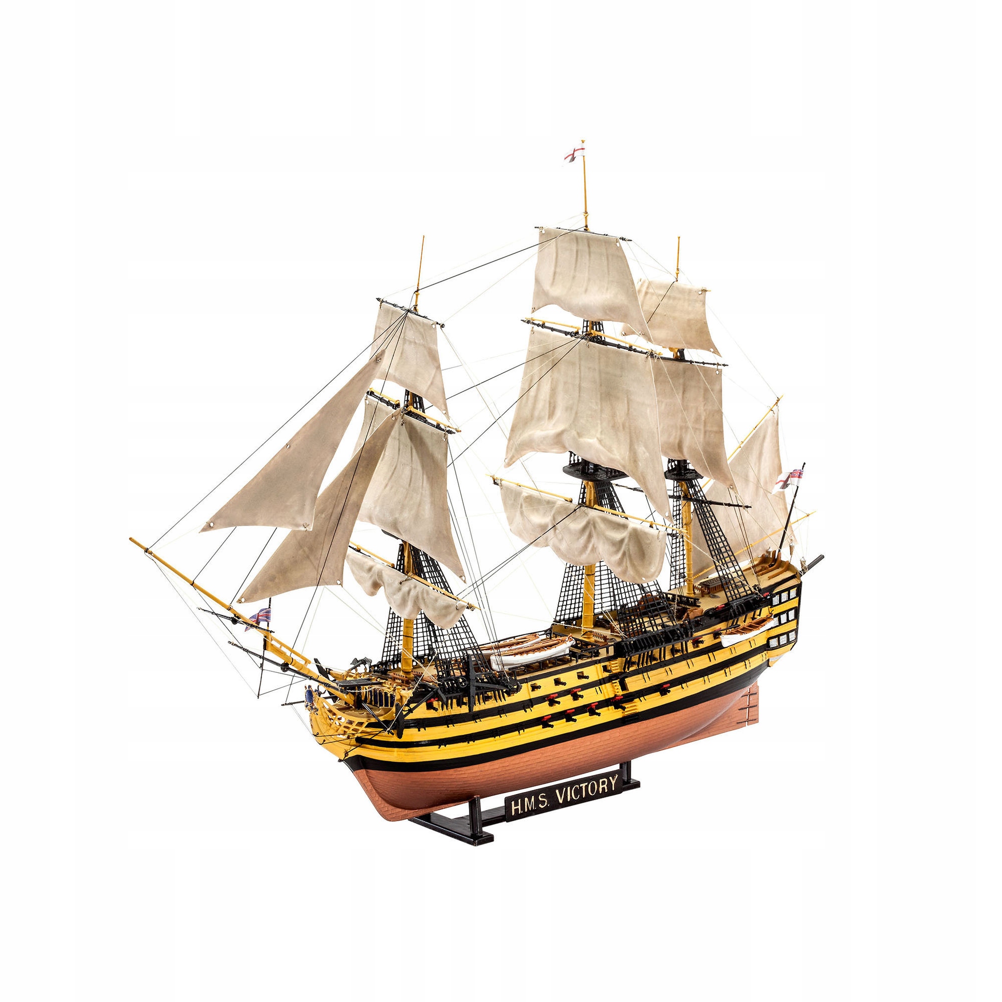 Набор пластиковых моделей REVELL. «Виктори» был флагманским военным кораблем адмирала Нельсона во время знаменитой Трафальгарской битвы в 1805 году. Адмирал Нельсон одержал своим флотом впечатляющую победу над флотом Наполеона, но сам получил смертельные ранения. Особенности набора: - Исключительно детализированные борта корпуса - Структурированная палуба - Артиллерия - Множество деталей - Декоративно украшенный нос - Детализированные мачты с верхней корзиной - Штаги - В комплект входит такелаж - Карта с флагом - В комплект входит плакат Победы размером 60 х 42 см! Подарочный набор с аксессуарами для лепки (6 основных красок, кисть, клей).
