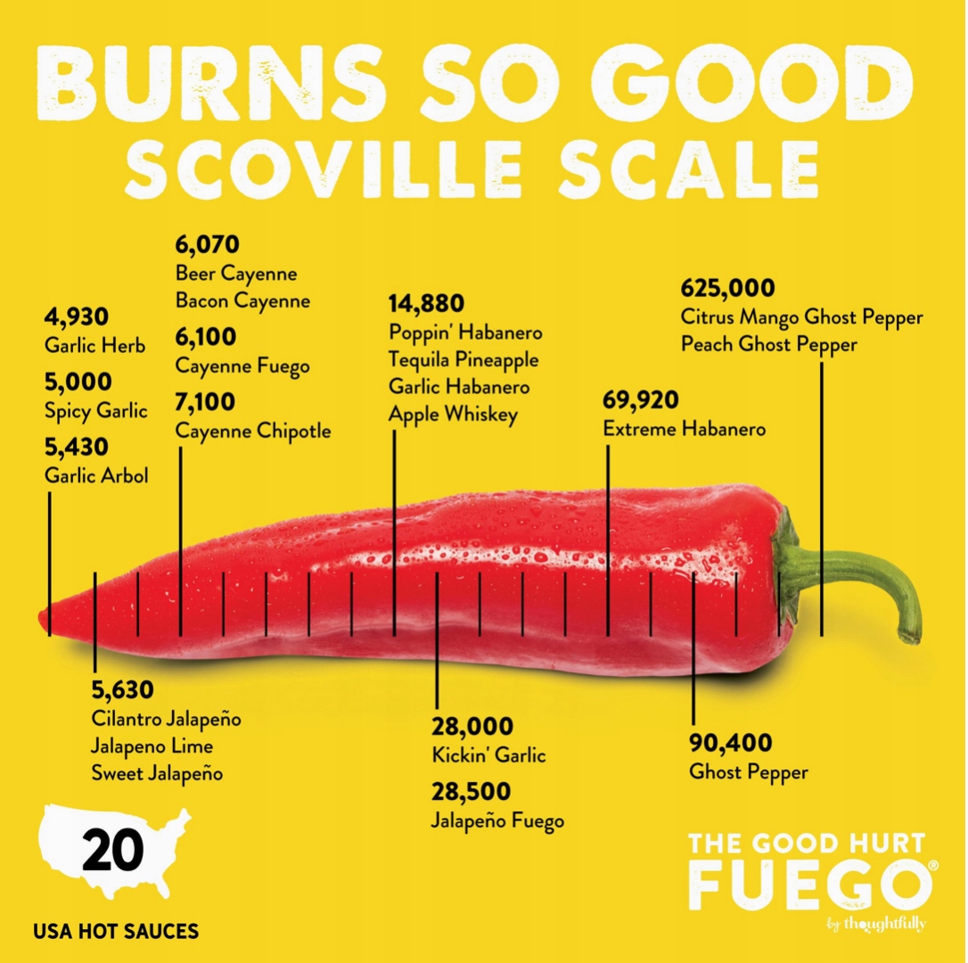 Ассортимент специй: исследуйте различные уровни шкалы Сковилла с 20 вкусами острых соусов.