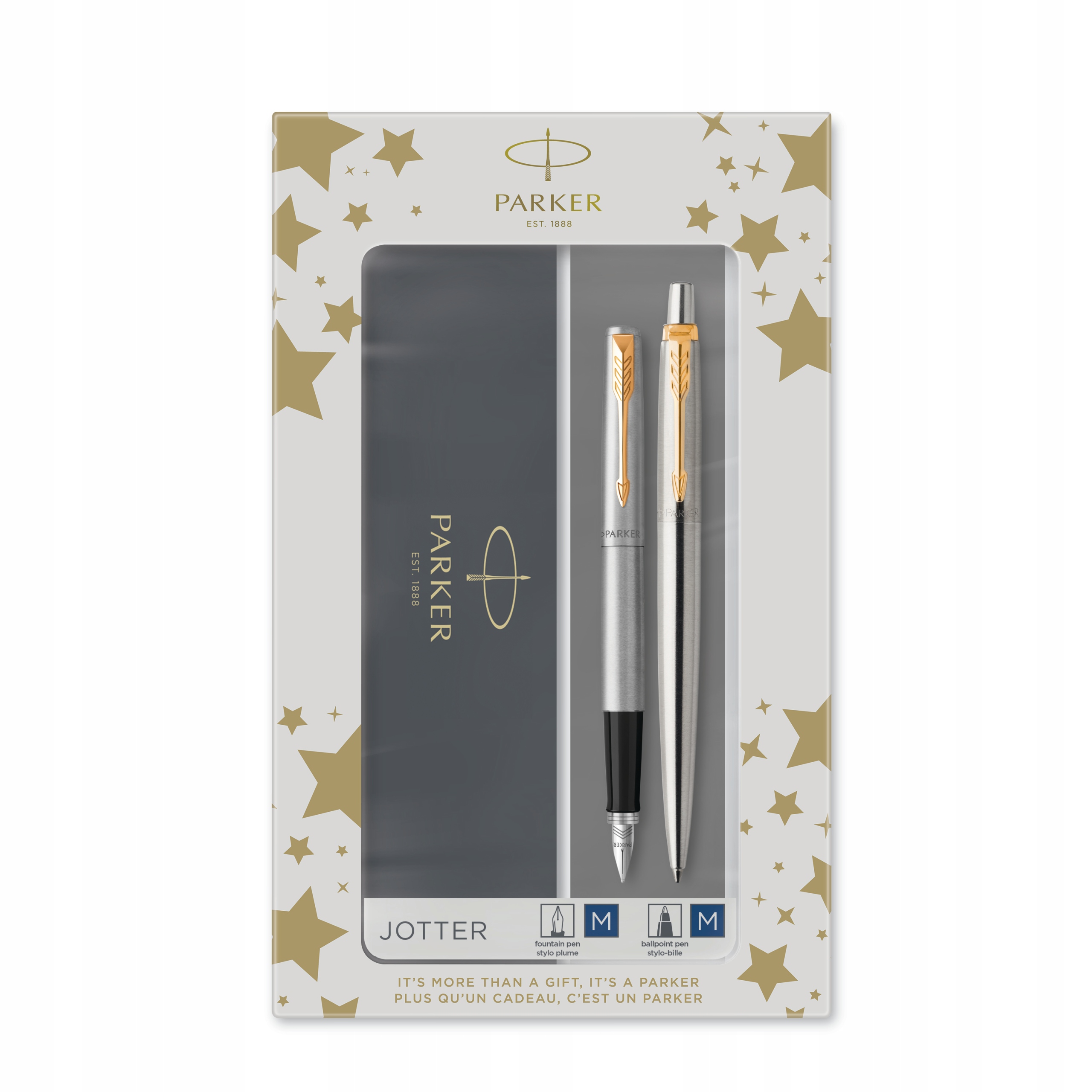 Набор Parker с шариковой и перьевой ручкой Jotter,нержавеющая сталь с золотой отделкой, синий стержень и картридж, декоративный футляр.