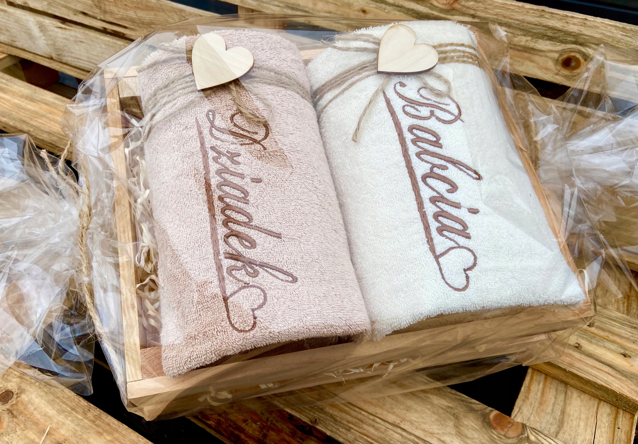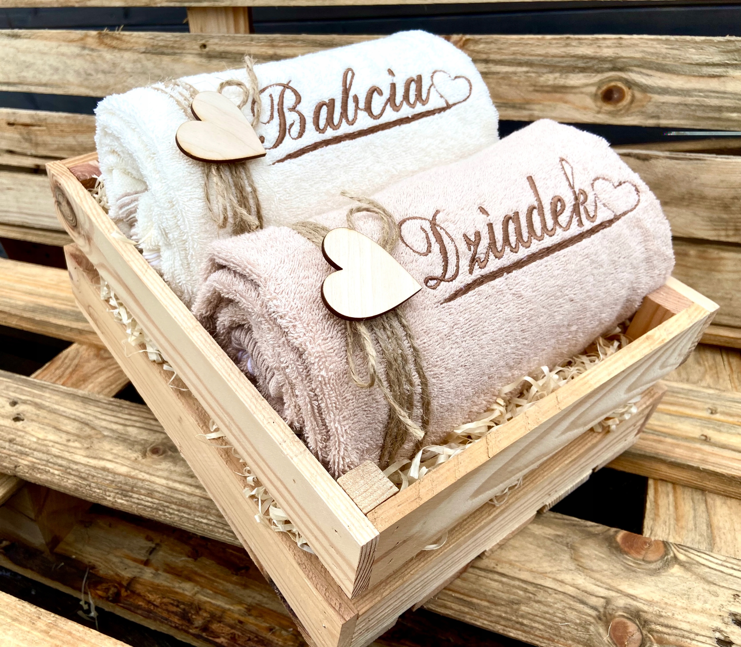 Красивый и практичный подарок для бабушки и дедушки — набор из 2-х банных полотенец с вышивкой — все красиво упаковано в деревянную коробку.