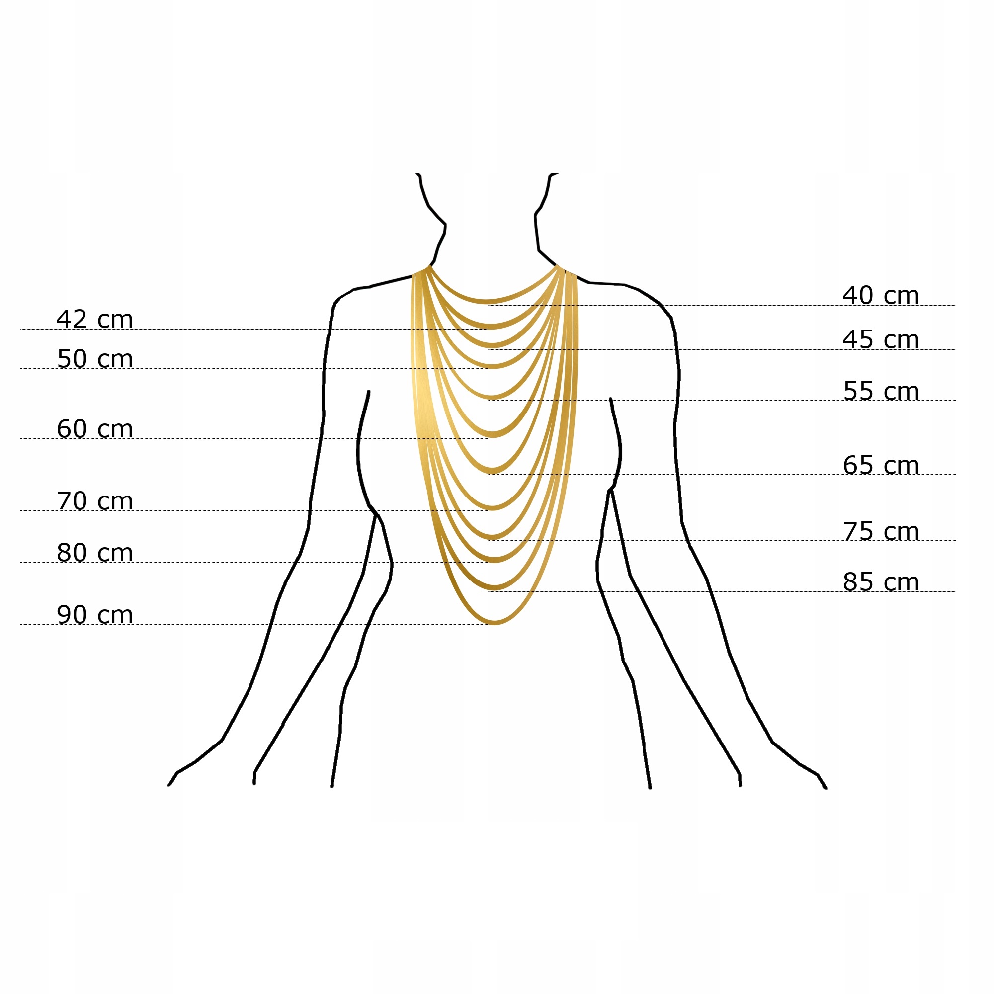 Иллюстрация представляет приблизительно то, что силуэт отражается на индивидуальной длине цепи. Однако, пожалуйста, помните, что в зависимости от позы, ожерелья могут выглядеть немного по -другому. Таким образом, безопаснее, с помощью куска струны или нити, стоящего перед зеркалом, измеряйте правильную длину >