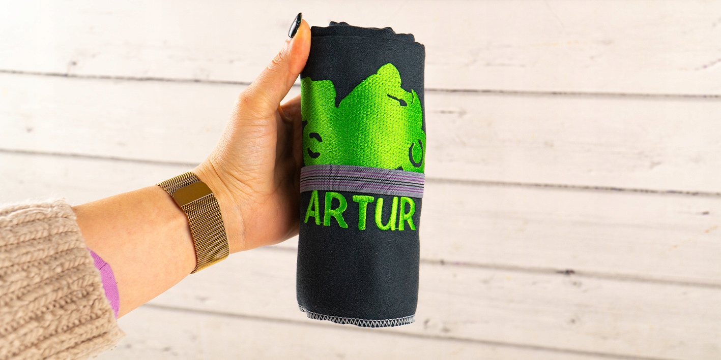 К полотенцу вшита практичная резинка, которая позволяет как свернуть полотенце в рулон, занимающий совсем немного места, так и свернуть мокрое полотенце в «клубок», или подвесить полотенце. где угодно.