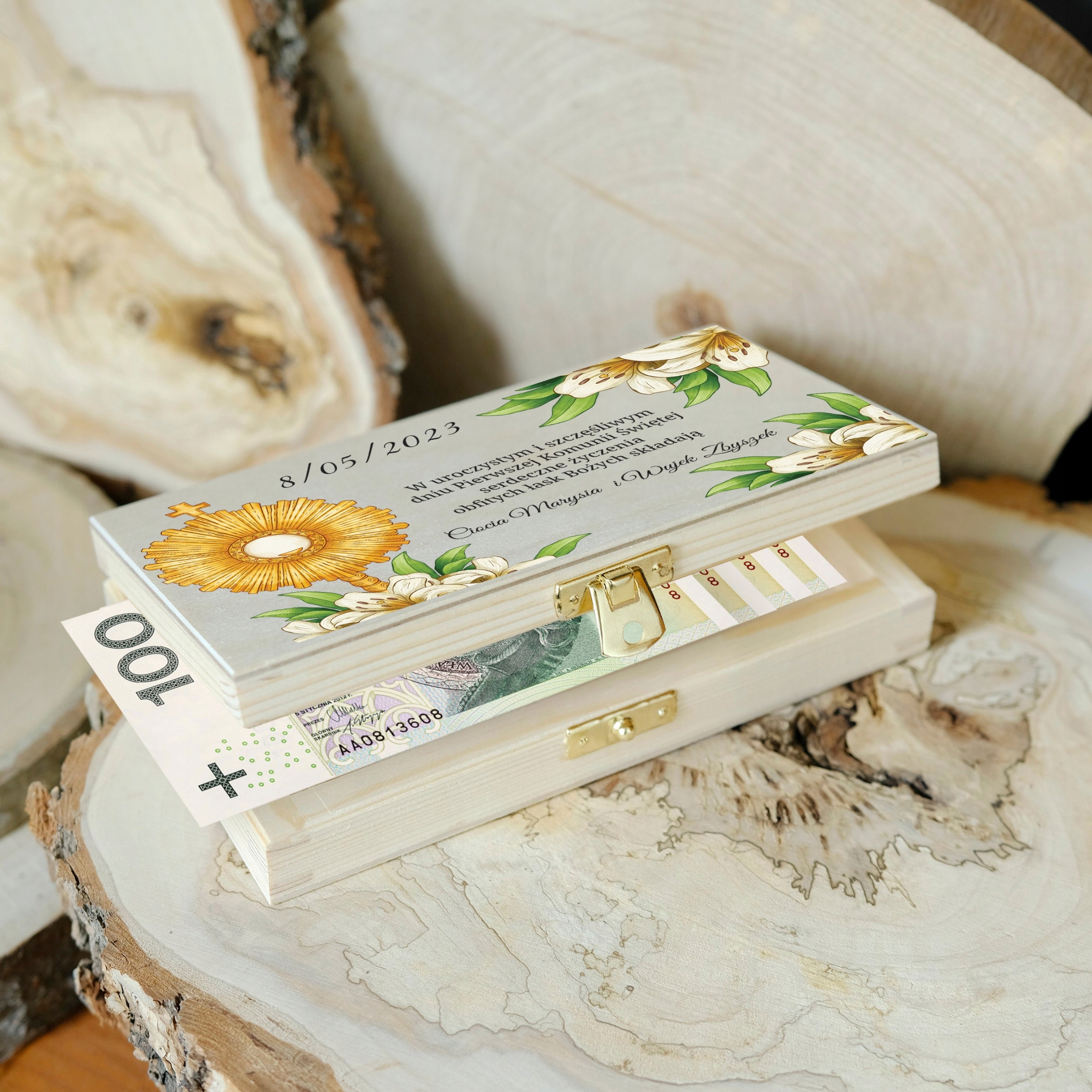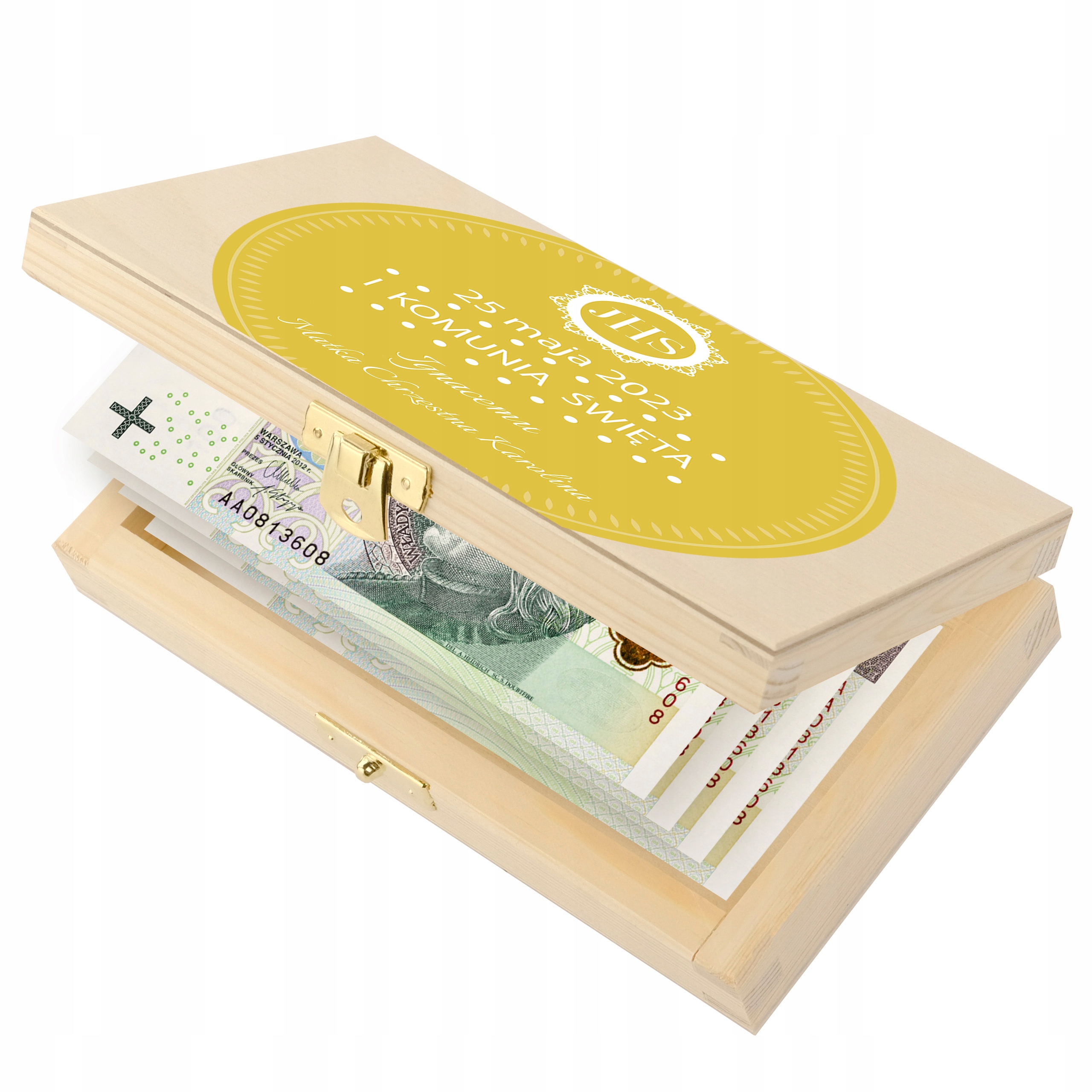 Размер коробки идеально соответствует размеру банкнот. Высота 3,5 см позволит разместить большую сумму наличных, а в длину и ширину легко поместится купюра номиналом 500 злотых.