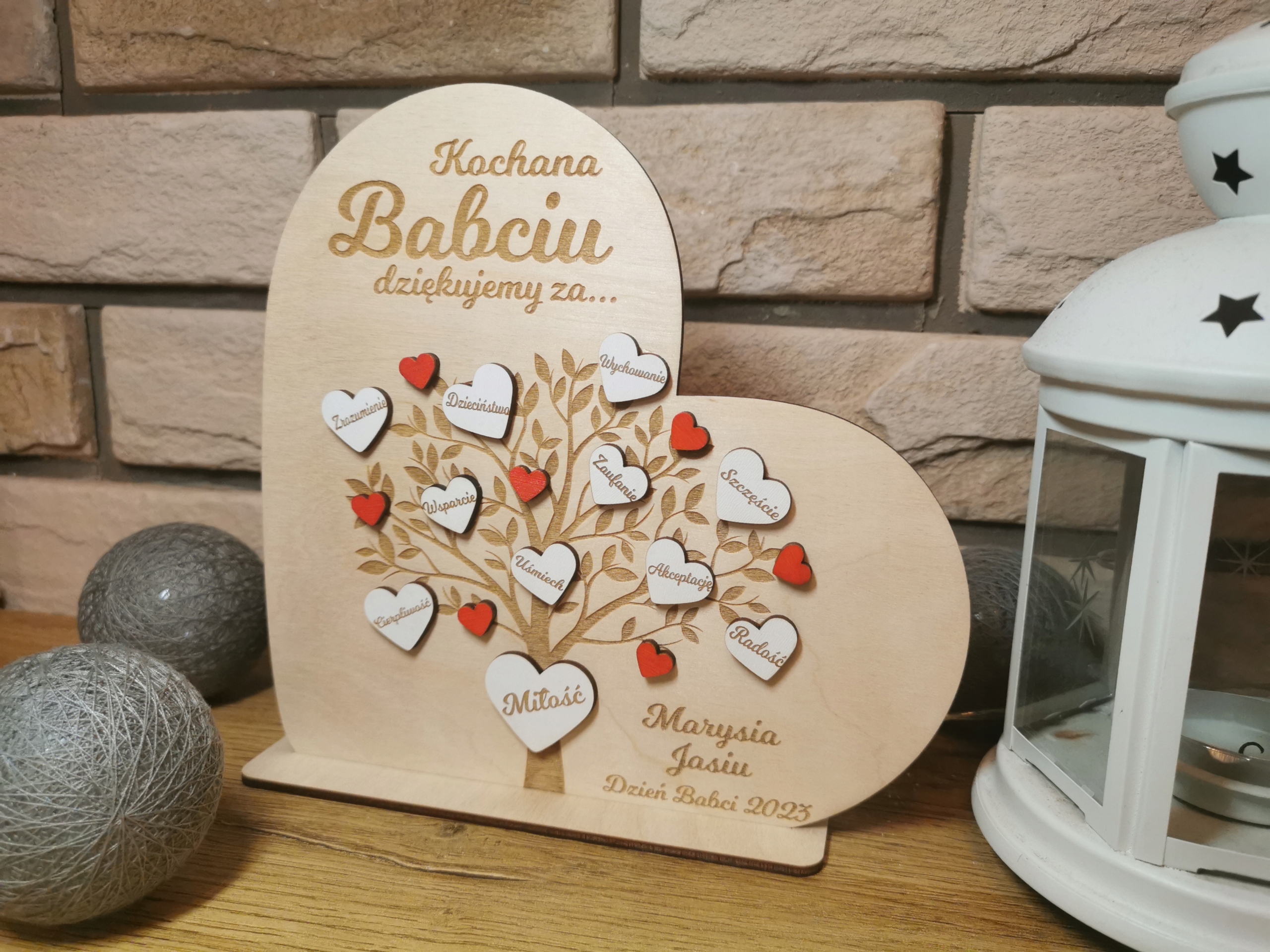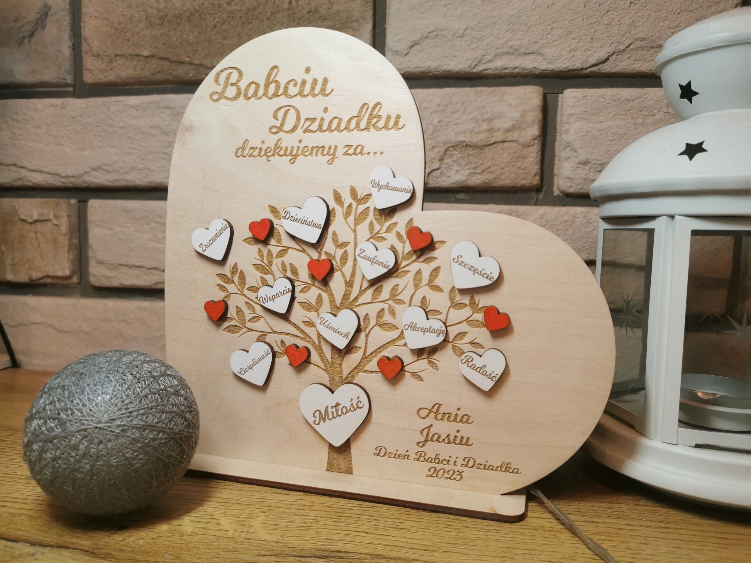Деревянное сердце с спасибо Бабушке и Дедушке с подписью.